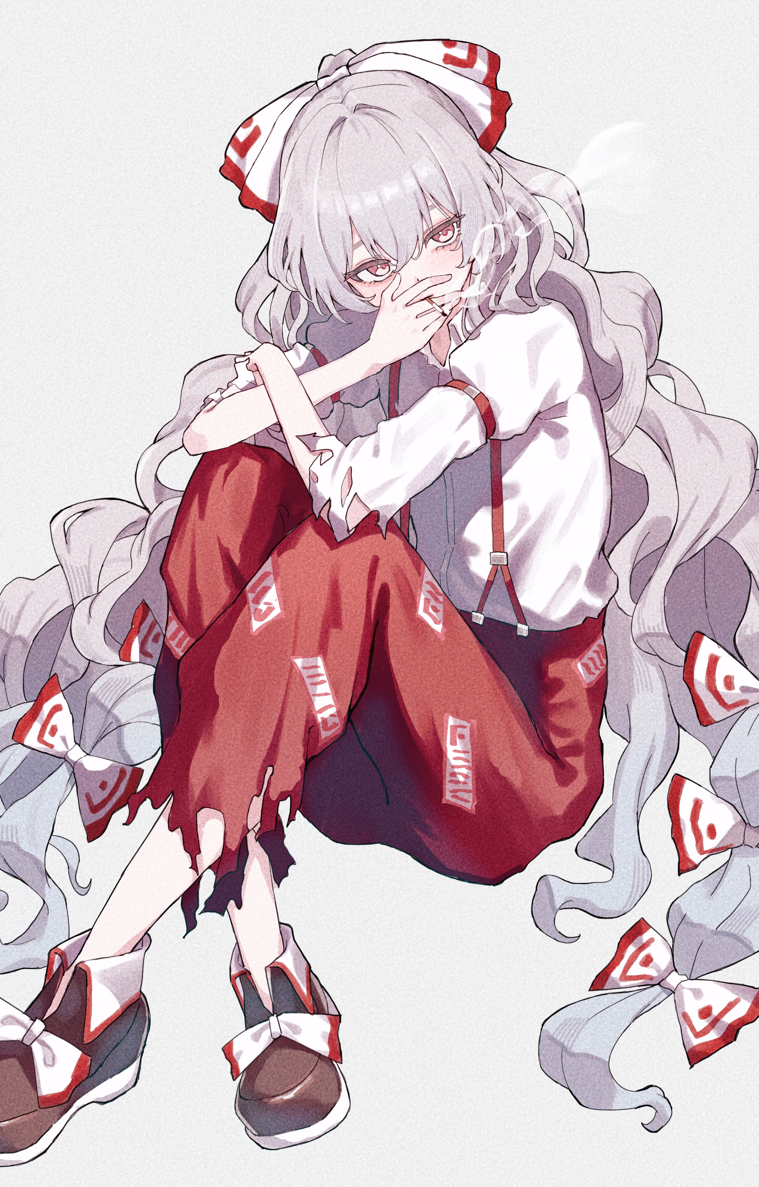 1girl absurdly_long_hair absurdres between_fingers boots bow brown_boots cigarette collared_shirt commentary fujiwara_no_mokou full_body grey_hair hair_bow highres holding holding_cigarette kaminose long_hair multiple_hair_bows pants red_eyes red_pants shirt simple_background sitting smoking solo suspenders torn_clothes torn_pants torn_shirt touhou very_long_hair wavy_hair white_background white_bow white_shirt