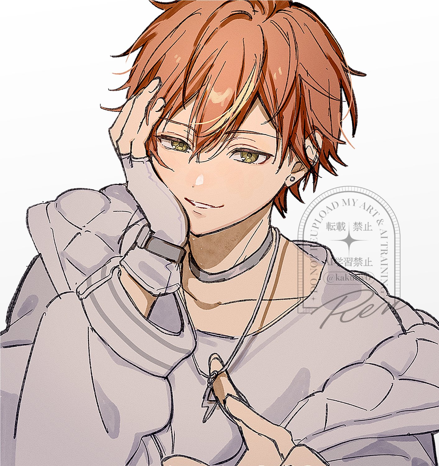 commentary earrings fingerless_gloves gloves green_eyes hand_on_own_cheek hand_on_own_face highres jacket jewelry long_sleeves necklace orange_hair project_sekai ren_(furogirai) shinonome_akito shirt smirk teeth untranslatable_commentary white_background white_gloves white_jacket white_shirt