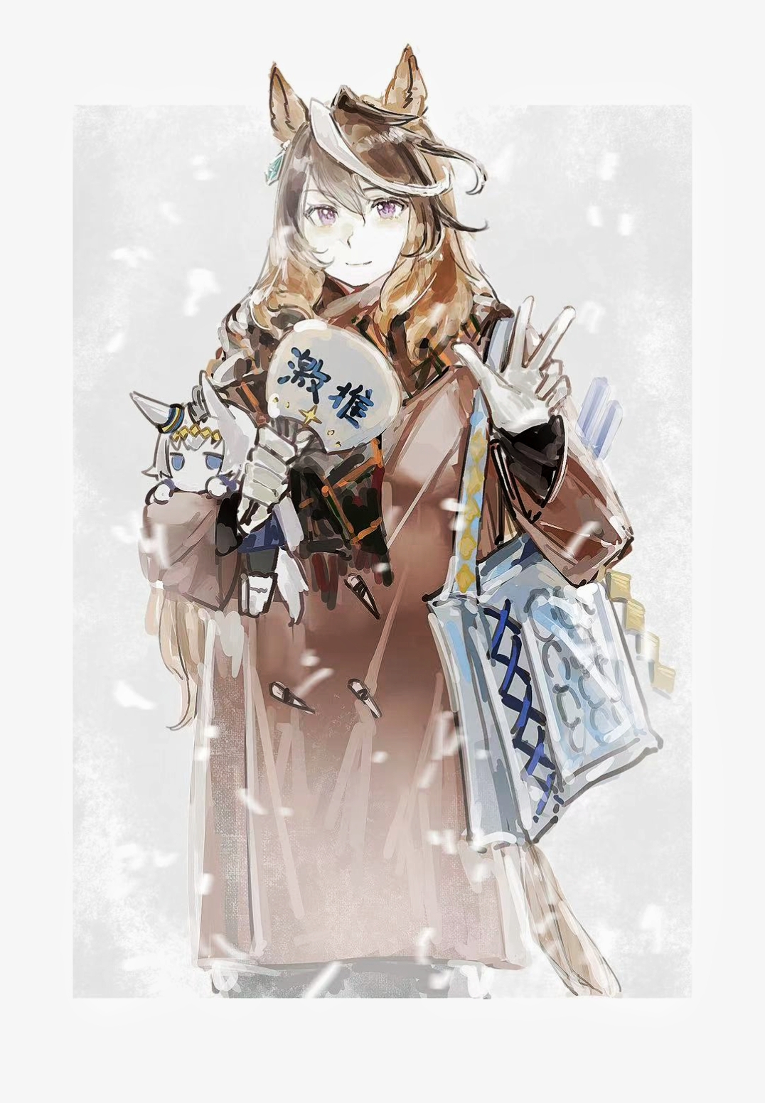 1girl animal_ears bag black_pantyhose blue_eyes blue_skirt brown_cat brown_hair cat character_doll coat commentary_request doll earrings gloves grey_hair hair_between_eyes hand_fan highres holding holding_doll holding_fan horse_ears horse_girl jewelry long_hair long_sleeves looking_at_viewer multicolored_hair nanjiaobeiyuan oguri_cap_(starlight_beat)_(umamusume) oguri_cap_(umamusume) pantyhose paper_fan purple_eyes scarf shoulder_bag single_earring skirt snowing streaked_hair stuffed_toy symboli_rudolf_(umamusume) uchiwa umamusume w white_gloves white_hair winter_clothes winter_coat