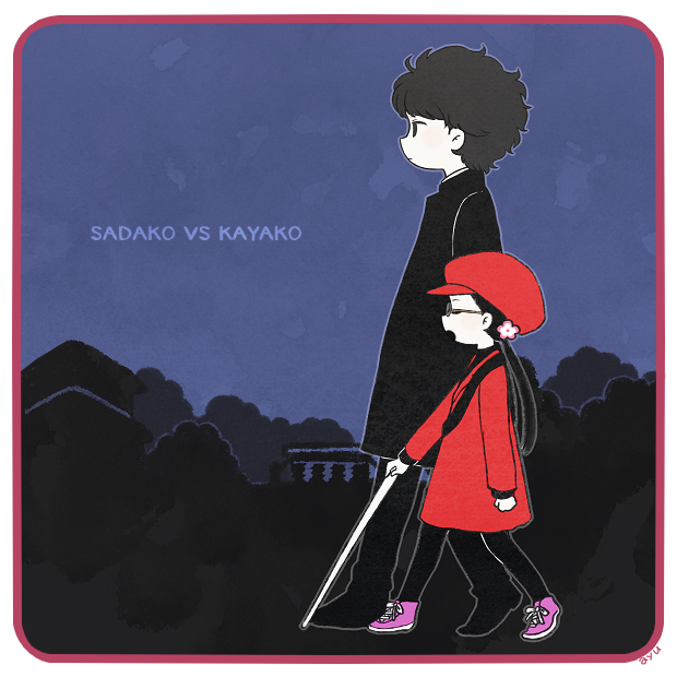 1boy 1girl ayu_(mog) black_coat black_hair closed_eyes coat commentary_request copyright_name curly_hair full_body glasses hat long_hair open_clothes open_coat open_mouth pink_shoes profile red_coat red_hat sadako_vs._kayako shoes short_hair simple_background tamao_(sadako_vs._kayako) tokiwa_keizou_(sadako_vs._kayako) walking white_background