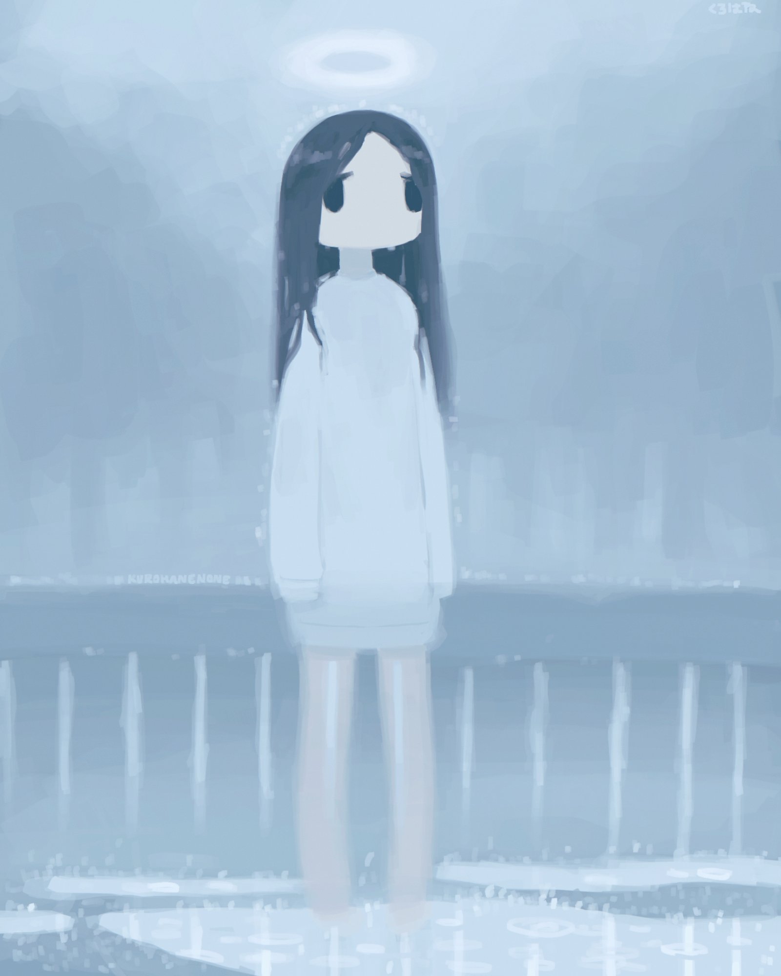 1girl artist_name barefoot black_eyes black_hair blank_eyes commentary glowing glowing_halo halo highres kurohanenone long_hair no_mouth no_pants original outdoors puddle rain see-through_body sweater wet wet_clothes wet_hair white_sweater