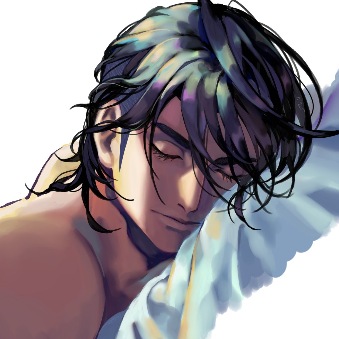 1boy black_hair closed_eyes closed_mouth commentary_request dutch_angle eyelashes hair_between_eyes nicoliarts nintendo pokemon pokemon_sword_and_shield raihan_(pokemon) sideburns sleeping solo topless_male