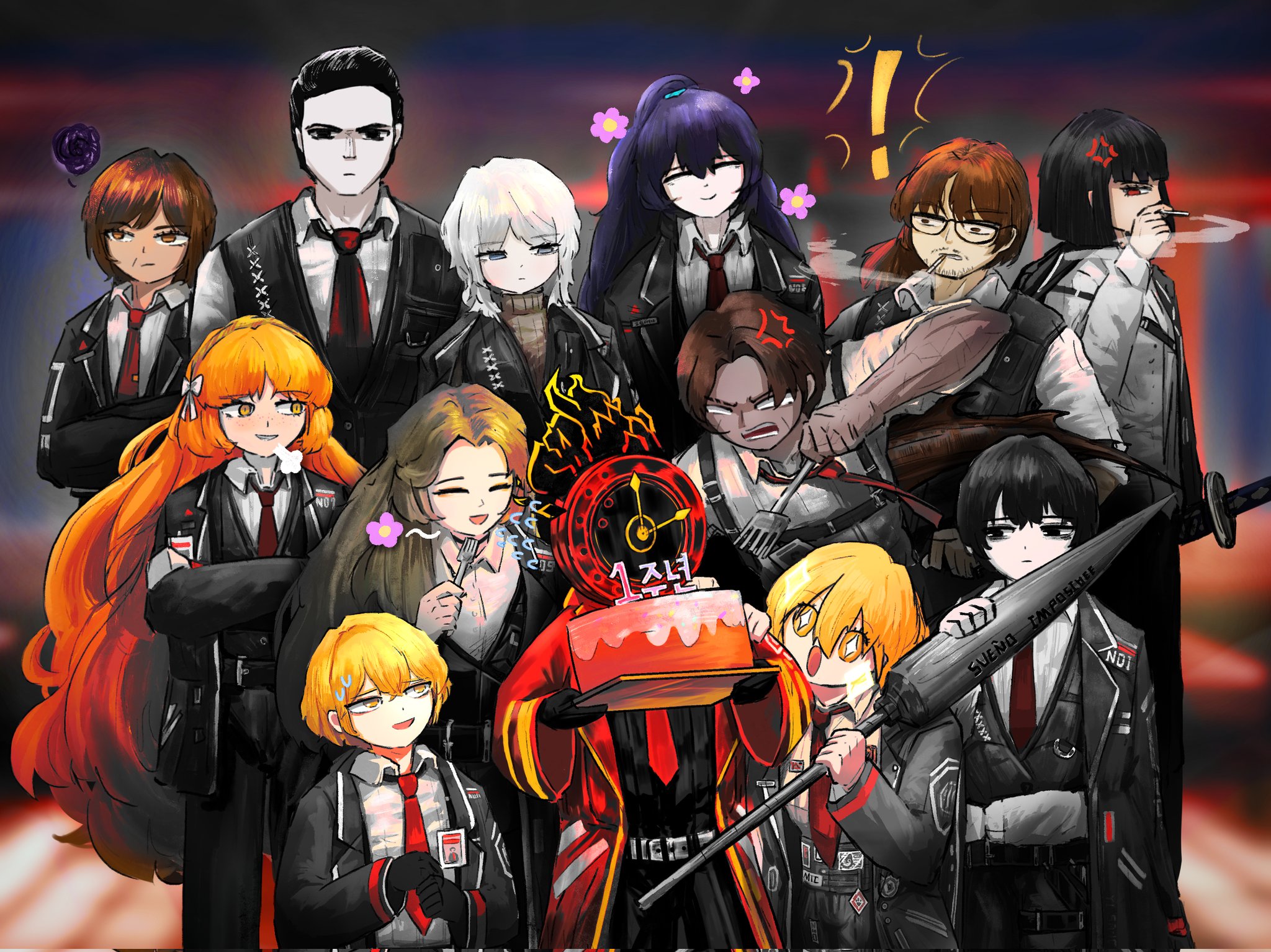 ! 1other 6+boys 6+girls :d ^_^ anger_vein anniversary bags_under_eyes belt black_gloves black_hair black_pants black_shirt black_suit blonde_hair blue_hair blurry blurry_background blye_eyes brown_eyes brown_hair brown_sweater cake chest_strap cigarette closed_eyes coat collared_shirt commentary_request crossed_arms dante_(limbus_company) don_quixote_(project_moon) facial_hair faust_(project_moon) flying_sweatdrops food fork formal_clothes gloves gregor_(project_moon) ha7437742 heathcliff_(project_moon) highres holding holding_cake holding_cigarette holding_food holding_polearm holding_weapon hong_lu_(project_moon) ishmael_(project_moon) jitome korean_commentary limbus_company long_hair looking_at_viewer meursault_(project_moon) multiple_boys multiple_girls necktie object_head ootachi open_mouth outis_(project_moon) pants polearm ponytail project_moon red_coat red_eyes red_necktie rodion_(project_moon) ryoshu_(project_moon) shirt short_hair sinclair_(project_moon) smile smoking suit suspenders sweatdrop sweater weapon white_belt white_shirt yellow_eyes yi_sang_(project_moon)