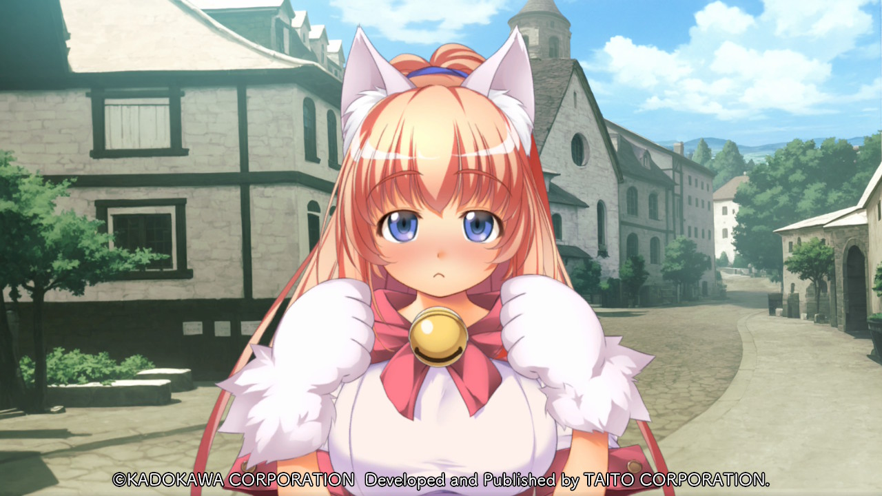 1girl :< animal_ear_fluff animal_ears animal_hands atelier-moo bell blue_eyes blush breasts cat_ears cat_girl clenched_hands closed_mouth cloud company_name copyright_notice embarrassed game_cg gloves hair_between_eyes hands_up high_ponytail house large_breasts large_variant_set long_hair looking_at_viewer melody_sinclair_(revival) neck_bell non-web_source official_art paw_gloves pink_hair ponytail shirt short_sleeves sidelocks sky solo tareme town tree upper_body upturned_eyes variant_set white_gloves white_shirt yuukyuu_gensoukyoku yuukyuu_gensoukyoku_revival