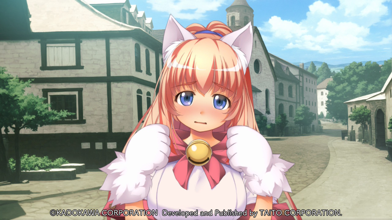 1girl animal_ear_fluff animal_ears animal_hands atelier-moo bell blue_eyes blush breasts cat_ears cat_girl clenched_hands cloud company_name copyright_notice embarrassed game_cg gloves hair_between_eyes hands_up head_tilt high_ponytail house large_breasts large_variant_set long_hair looking_at_viewer melody_sinclair_(revival) neck_bell non-web_source official_art open_mouth paw_gloves pink_hair ponytail raised_inner_eyebrows shirt short_sleeves sidelocks sky solo tareme town tree upper_body variant_set white_gloves white_shirt yuukyuu_gensoukyoku yuukyuu_gensoukyoku_revival