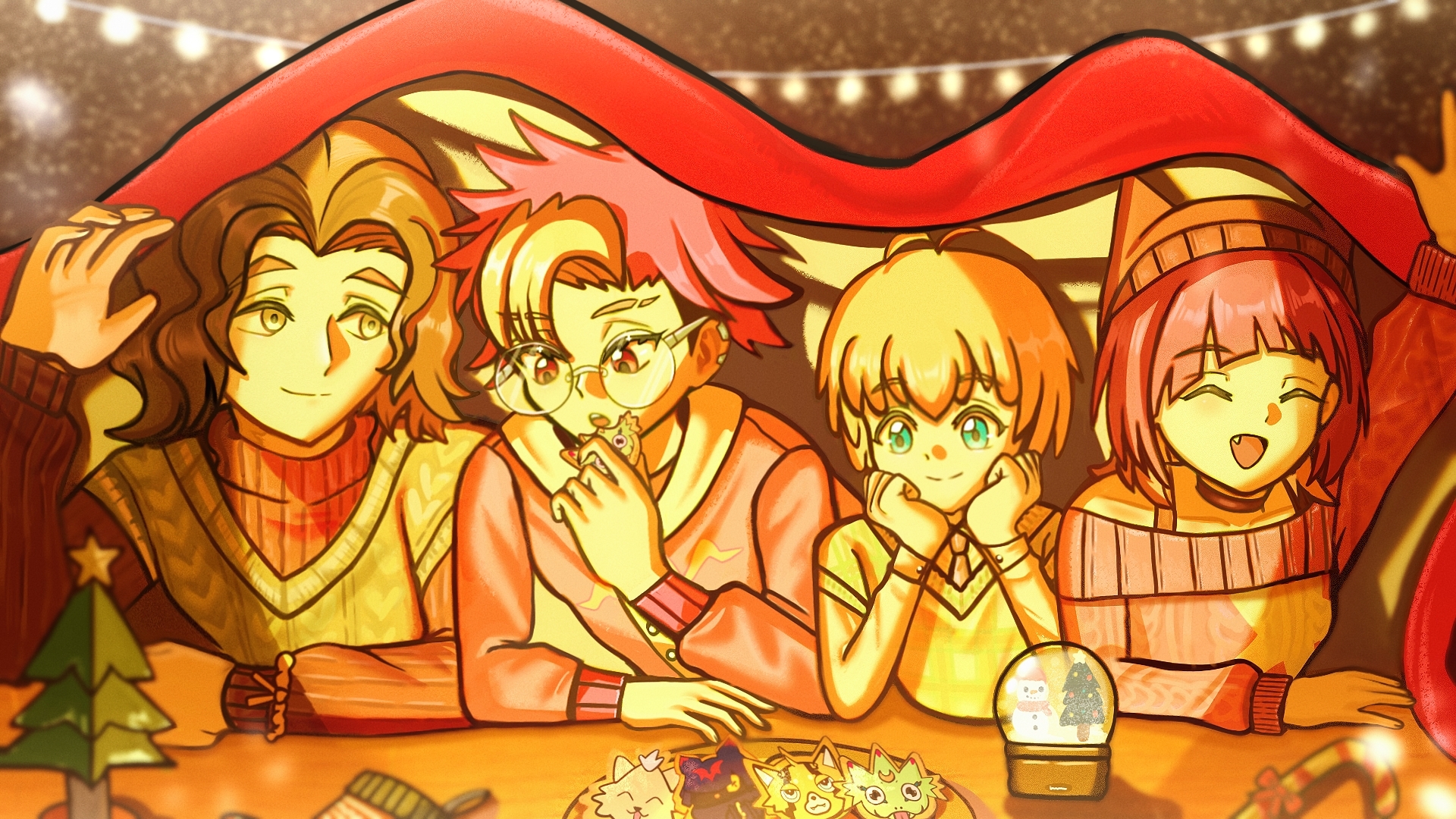 chiropmon christmas digimon digimon_beatbreak fang gekkomon glasses happy highres kuonji_makoto looking_at_another nightmumu pristimon sakuya_reina sawashiro_kyo smile tenma_tomoro