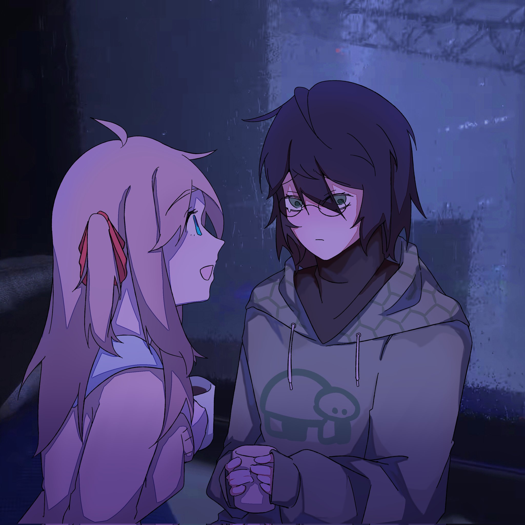 1boy 1girl :d ahoge black_shirt blue_eyes blue_sailor_collar brown_hair cityscape closed_mouth coffee coffee_mug commentary complex1860699 cup drawstring english_commentary glasses green_eyes green_hoodie hair_between_eyes hair_ribbon hexagon_print highres holding holding_cup hood hoodie indoors long_hair long_sleeves messy_hair mug neuro-sama open_mouth rain raised_eyebrows red_ribbon ribbon sailor_collar shirt short_hair sidelocks sideways_mouth smile tearing_up turtle turtleneck two_side_up vedal987 vedal_ai window