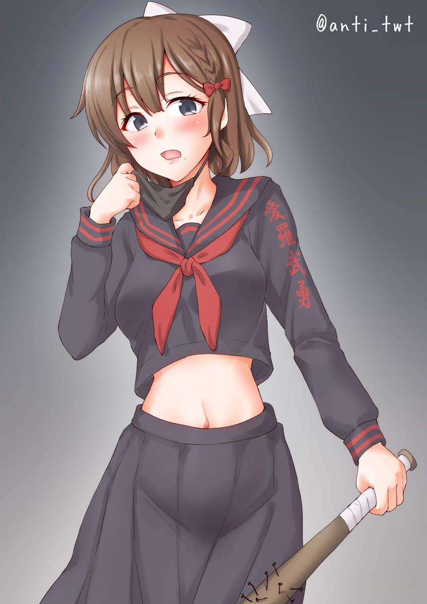 1girl alternate_costume anti_(untea9) asahi_(kancolle) baseball_bat black_mask black_serafuku black_skirt braid breasts brown_hair clothes_writing commentary_request grey_eyes hair_ribbon highres kantai_collection long_skirt long_sleeves looking_at_viewer mask mask_pull medium_breasts midriff mole mole_under_mouth mouth_mask nail_(hardware) nail_bat navel neckerchief open_mouth pleated_skirt red_neckerchief ribbon school_uniform serafuku short_hair single_braid skirt solo surgical_mask white_ribbon