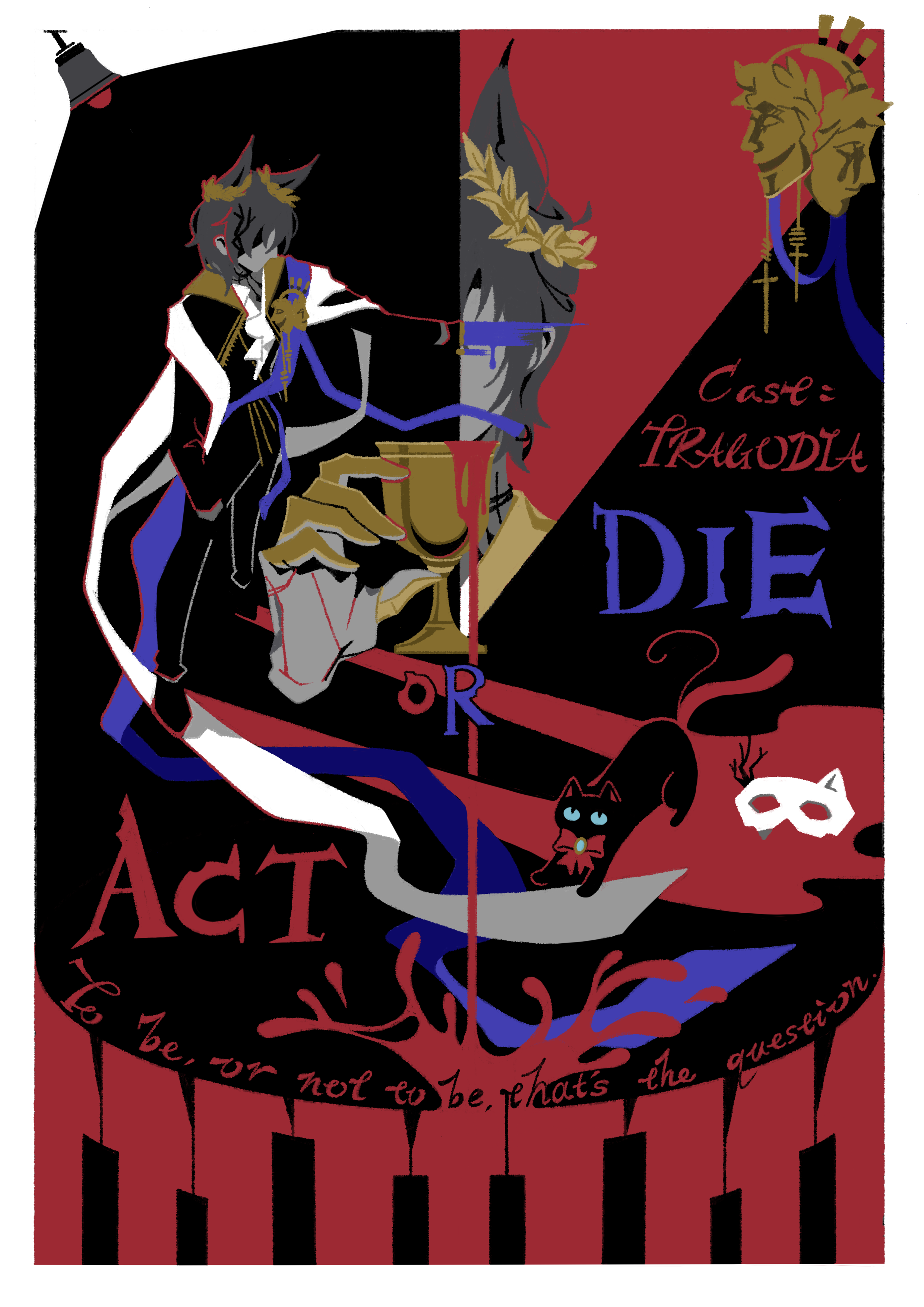 1boy absurdres animal animal_ears arknights black_cat black_jacket border brown_hair cat cat_ears character_name chinese_commentary commentary_request cup english_text flat_color gloves hair_over_one_eye hao_xiang_shi_hai_chang_lao_fan highres holding holding_cup jacket laurel_crown long_sleeves male_focus mask miss_christine_(arknights) multiple_views no_lineart phantom_(arknights) short_hair silhouette standing tragodia_(arknights) unworn_mask white_border