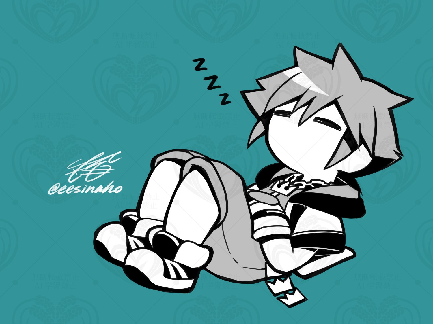 1boy blue_background closed_eyes commentary_request crown_necklace gloves hood hood_down hooded_jacket inaho_(sesyrne) jacket jewelry kingdom_hearts male_focus necklace open_clothes open_jacket pants shoes short_hair short_sleeves simple_background sleeping solo sora_(kingdom_hearts) spiked_hair twitter_username watermark zzz