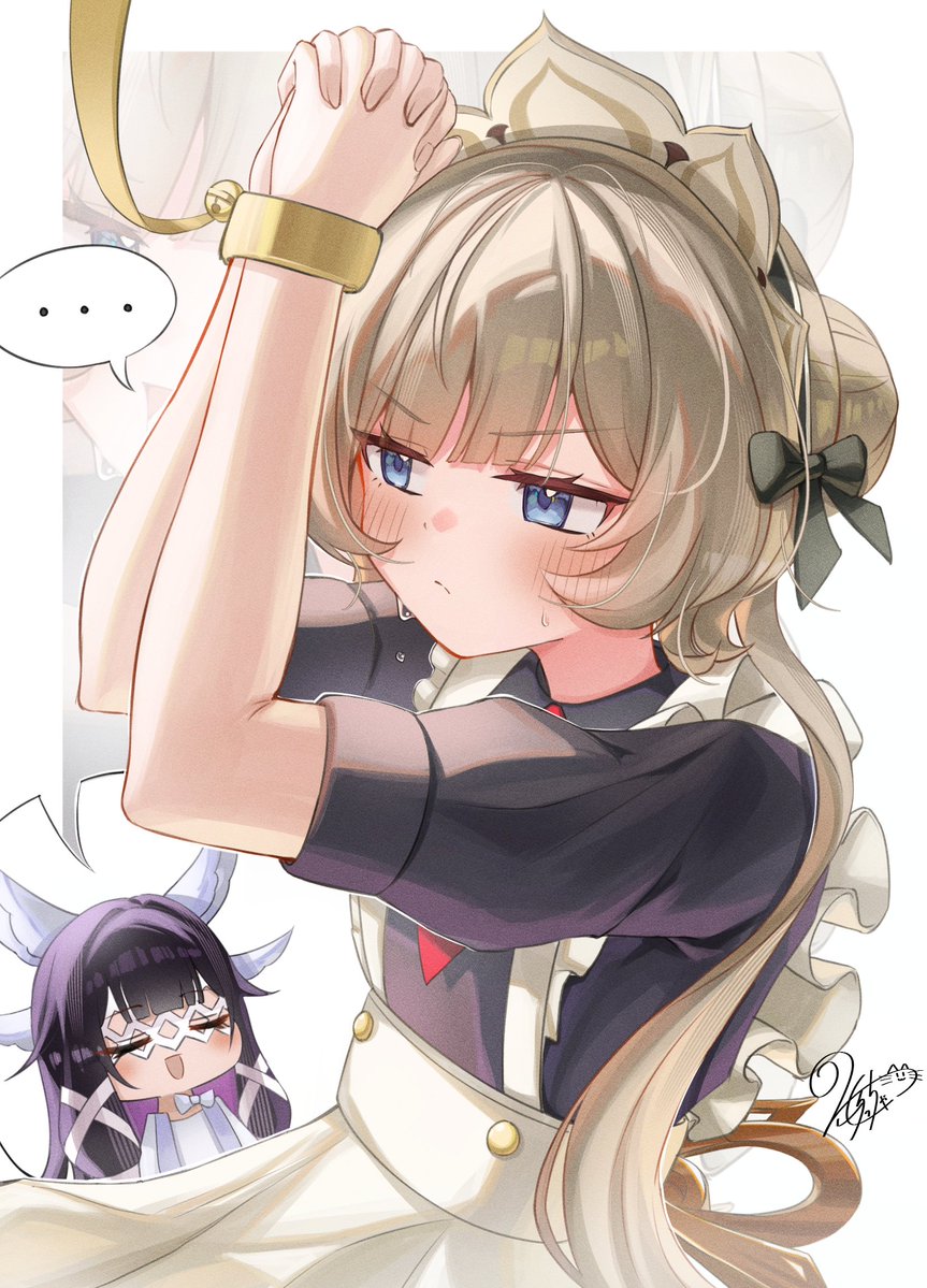 ... 2girls apron arms_up black_bow black_dress black_hair blue_eyes blush bound bound_wrists bow brown_hair chibi closed_eyes closed_mouth colored_inner_hair columbina_(genshin_impact) commentary_request dress eye_mask frilled_apron frills genshin_impact hair_bow hair_bun head_wings headdress long_hair maid_apron mask morocha1130 multicolored_hair multiple_girls own_hands_clasped own_hands_together purple_hair sandrone_(genshin_impact) signature spoken_ellipsis sweat two-tone_hair waist_apron white_apron white_bow wings zoom_layer