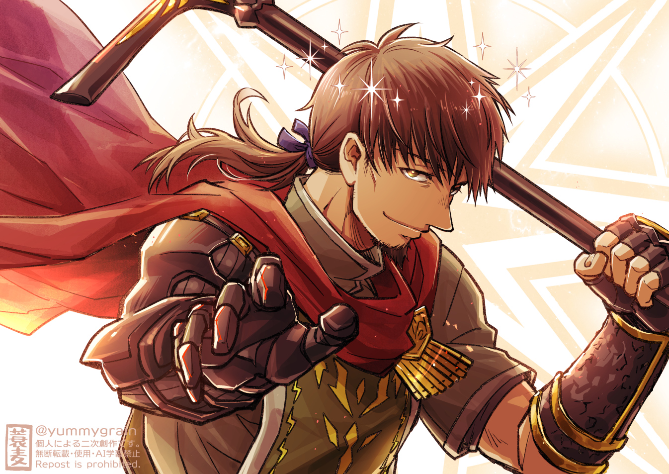 1boy brown_eyes brown_hair cape facial_hair fate/grand_order fate_(series) fingerless_gloves gauntlets gloves goatee hector_(fate) holding holding_polearm holding_weapon male_focus misuke_(gyouran) polearm red_cape single_fingerless_glove single_gauntlet smile spear weapon