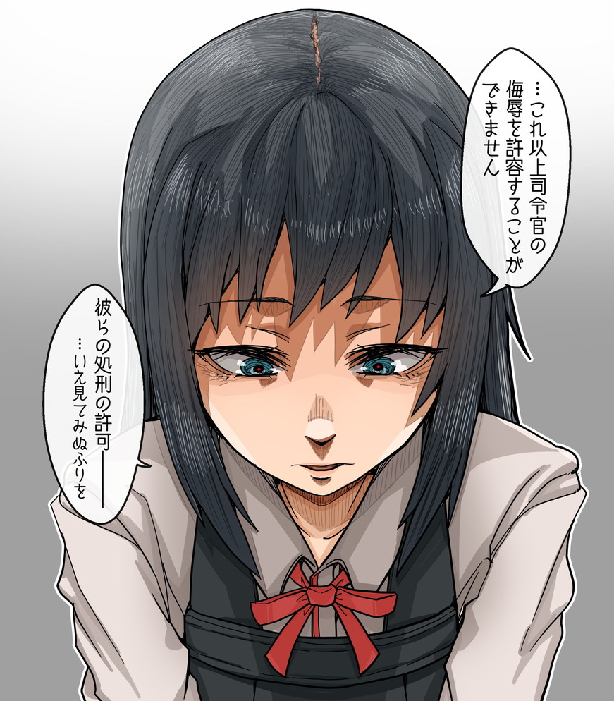 1girl asashio_(kancolle) asashio_kai_ni_(kancolle) black_dress black_hair blue_eyes collared_shirt commentary_request dress dress_shirt gradient_background grey_background kantai_collection long_hair looking_down pinafore_dress shirt sleeveless sleeveless_dress solo takasugi_heppu translation_request upper_body white_shirt