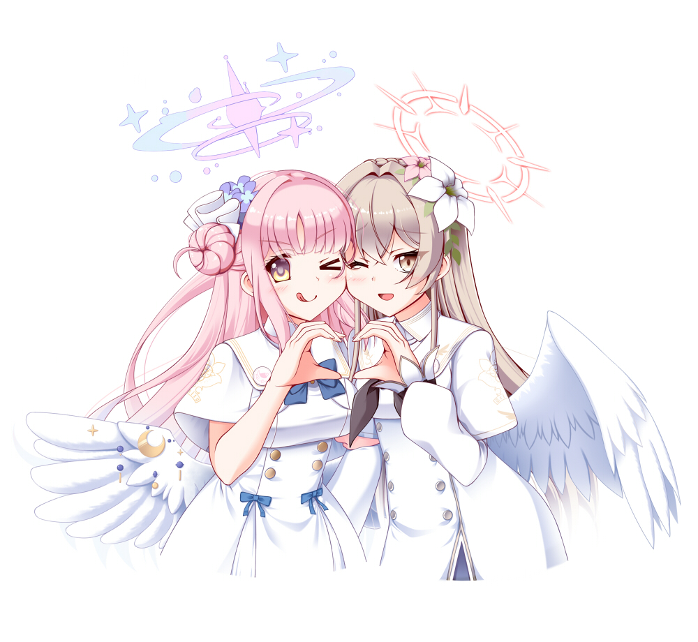 >_o 2girls ak@tsuki angel_wings black_neckerchief blue_archive blunt_bangs blush breasts brown_eyes brown_hair buttons capelet closed_mouth commentary_request double-breasted dress feathered_wings flower hair_between_eyes hair_bun hair_flower hair_ornament halo heart heart_hands heart_hands_duo long_hair looking_at_viewer looking_back medium_breasts mika_(blue_archive) multiple_girls nagisa_(blue_archive) neckerchief one_eye_closed open_mouth pantyhose pink_hair pink_halo purple_eyes simple_background single_hair_bun smile tongue tongue_out very_long_hair white_background white_capelet white_dress white_overskirt wing_ornament wings