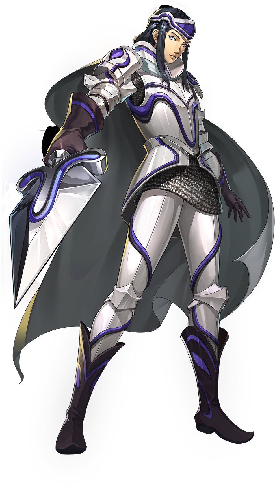 1boy armor artist_request black_hair blue_eyes boots breastplate cape chainmail cu_chulainn_(megami_tensei) demon_(megami_tensei) gloves grey_cape highres holding holding_weapon official_art persona persona_5 persona_5:_the_phantom_x pointing_melee_weapon shin_megami_tensei sidelocks solo standing third-party_source transparent_background weapon