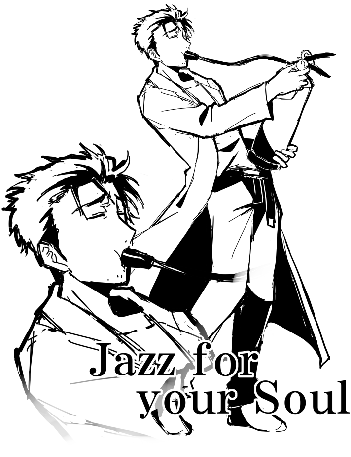 1boy closed_eyes english_text fire_extinguisher full_body greyscale high_contrast holding_fire_extinguisher jazz_for_your_soul_(meme) kuuma25_kuma lab_coat long_sleeves male_focus meme monochrome okabe_rintarou pants science_adventure short_hair simple_background solo standing steins;gate white_background zoom_layer