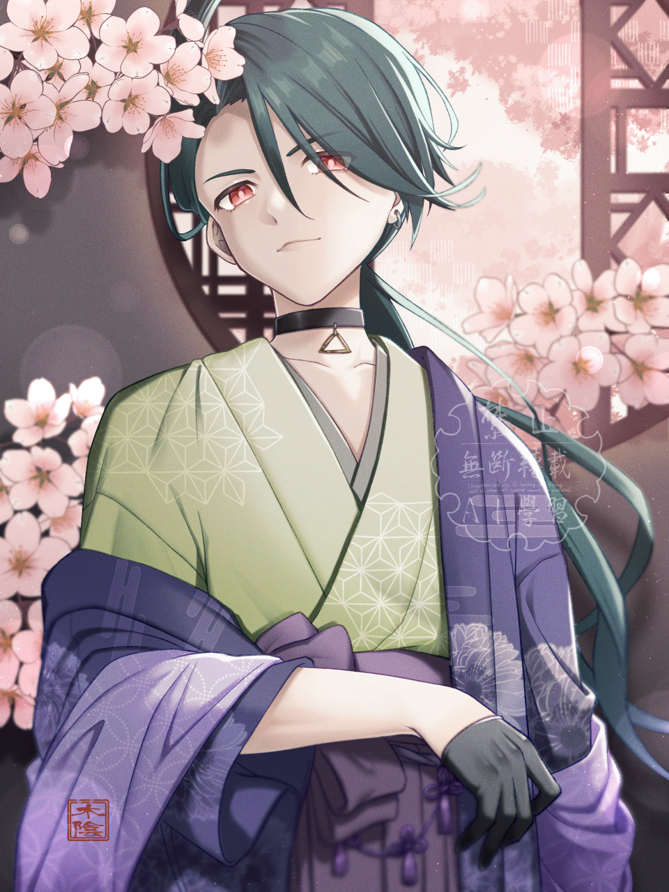 1girl alternate_costume black_choker blurry bright_pupils choker closed_mouth collarbone commentary_request earrings flower gloves green_hair green_kimono hakama hakama_skirt highres japanese_clothes jewelry kimono kokage_(hatomugi7422) long_hair nintendo pink_flower pokemon pokemon_scarlet_and_violet red_eyes rika_(pokemon) single_off_shoulder skirt solo watermark