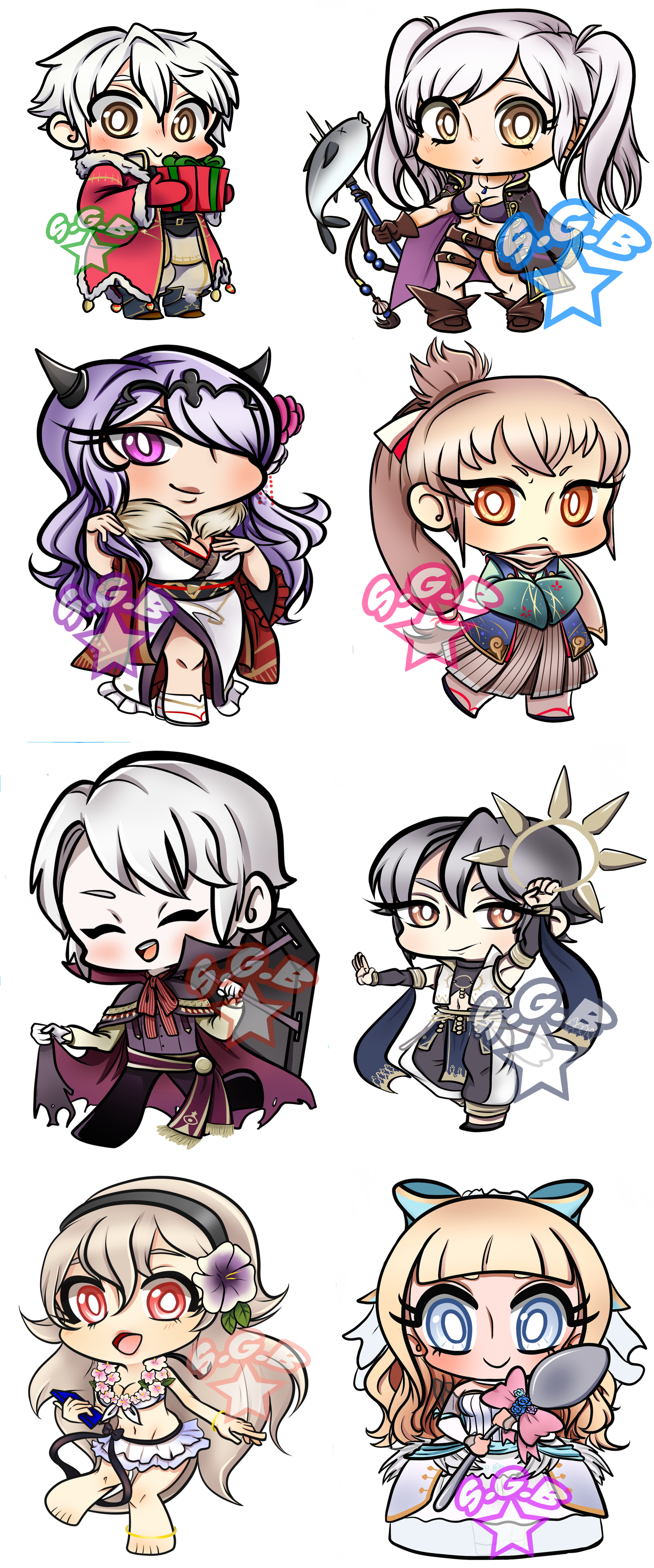 4boys 4girls absurdres astraundead bikini blonde_hair blue_eyes bow camilla_(fire_emblem) camilla_(holiday_traveler)_(fire_emblem) charlotte_(fire_emblem) charlotte_(money_maiden)_(fire_emblem) chibi closed_eyes dress female_corrin_(fire_emblem) female_corrin_(novice_vacationer)_(fire_emblem) female_robin_(fire_emblem) female_robin_(seaside_tactician)_(fire_emblem) fire_emblem fire_emblem_heroes flower grey_hair hair_bow hair_flower hair_ornament hair_over_one_eye hairband henry_(fire_emblem) henry_(happy_vampire)_(fire_emblem) highres inigo_(fire_emblem) inigo_(indigo_dancer)_(fire_emblem) japanese_clothes kimono male_robin_(festive_tactician)_(fire_emblem) male_robin_(fire_emblem) multiple_boys multiple_girls nintendo one_eye_covered orange_eyes purple_eyes purple_hair red_eyes simple_background spoon swimsuit takumi_(fire_emblem) takumi_(prince_of_soup)_(fire_emblem) tiara wedding_dress white_hair yellow_eyes