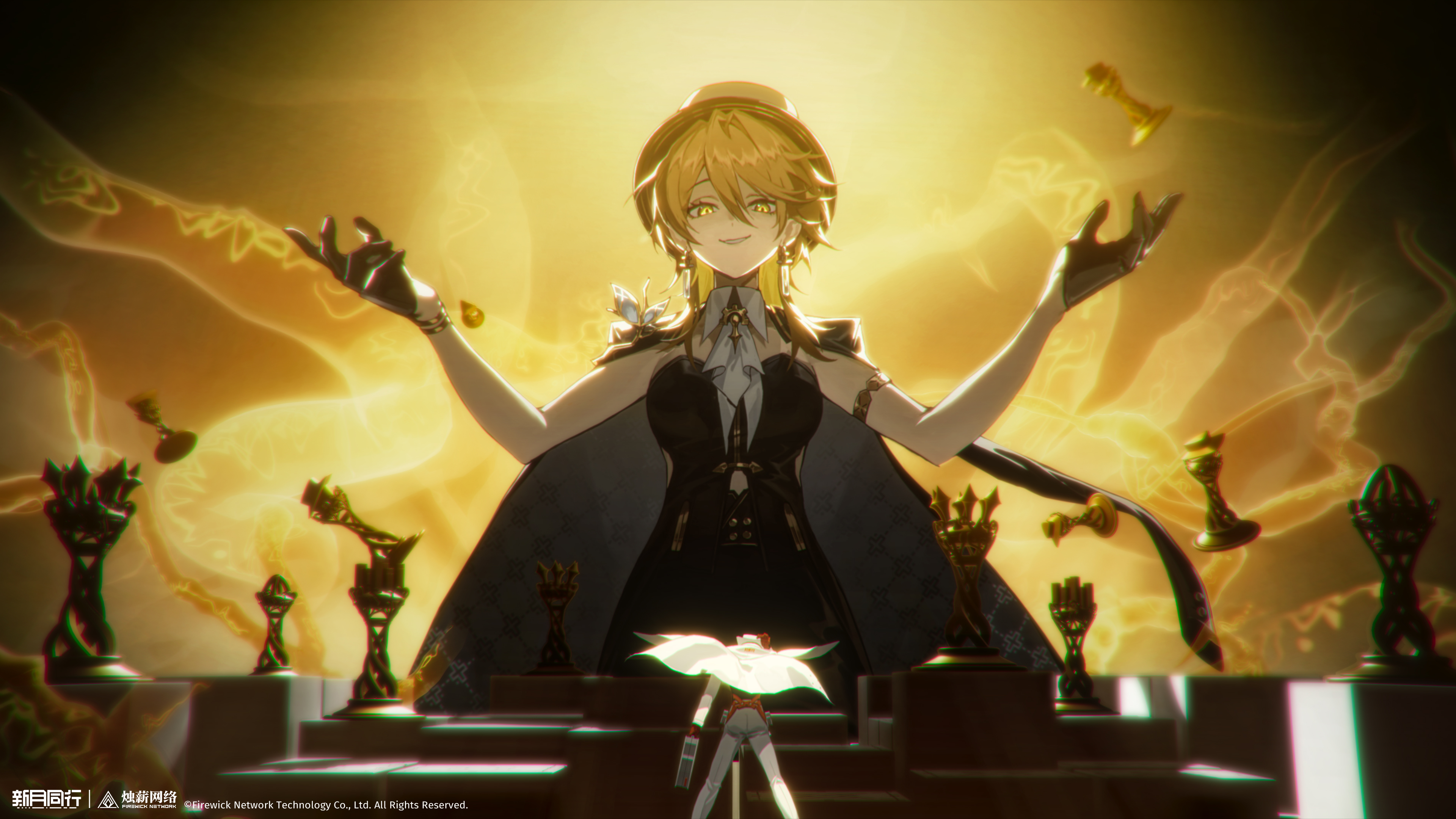 1girl 1other absurdres ascot backlighting black_cape black_dress black_gloves black_hat boater_hat breasts cape chess_piece coat copyright_name copyright_notice detached_collar dress from_behind gloves grin group_leader_(xinyue_tongxing) hands_up hat highres legs_apart logo looking_at_viewer luyou_(xinyue_tongxing) medium_hair mini_person official_art official_wallpaper pants smile standing strapless strapless_dress upper_body white_ascot white_coat white_pants xinyue_tongxing yellow_background yellow_eyes