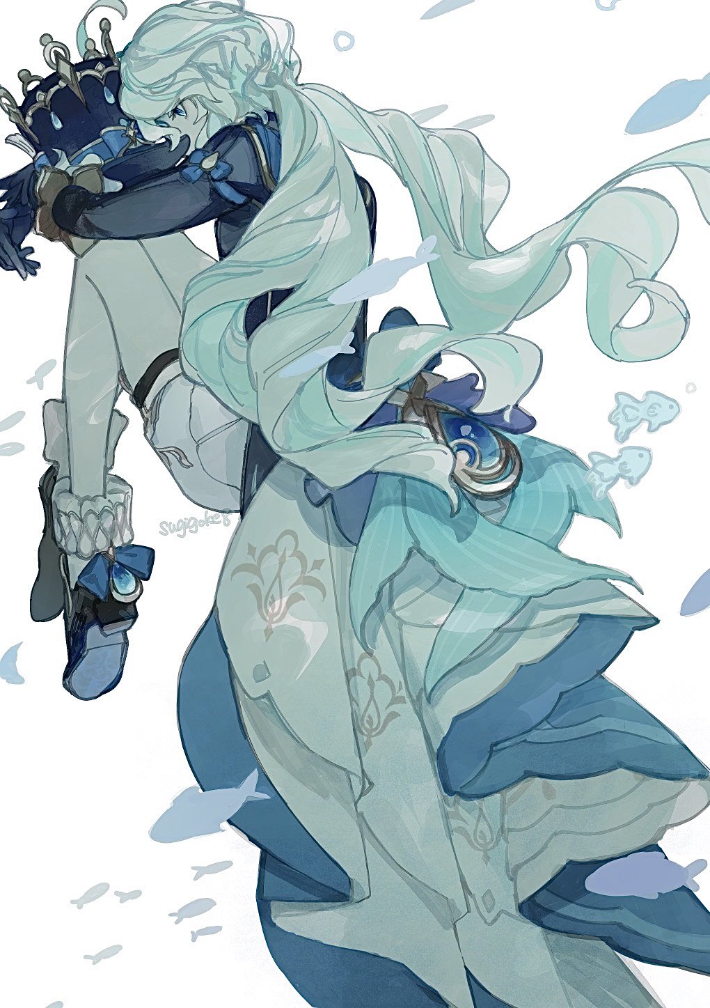 1girl bare_legs black_gloves black_shoes blue_hat fish furina_(genshin_impact) furina_(old_design)_(genshin_impact) genshin_impact gloves hat highres long_hair multicolored_hair missing_headwear shoes shorts simple_background sugigoke8 watermark white_background white_shorts