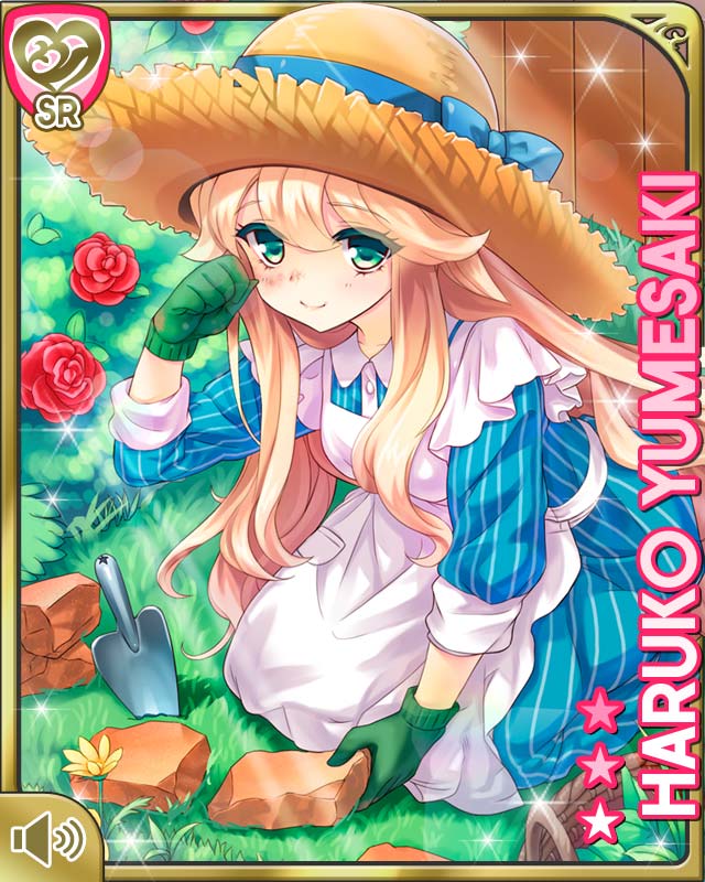 1girl apron blonde_hair blue_dress card_(medium) character_name dress flower girlfriend_(kari) gloves grass green_eyes green_gloves hat looking_at_viewer looking_up official_art qp:flapper shovel sitting sleeves_rolled_up smile solo straw_hat striped_clothes striped_dress vertical-striped_clothes vertical-striped_dress white_apron yumesaki_haruko