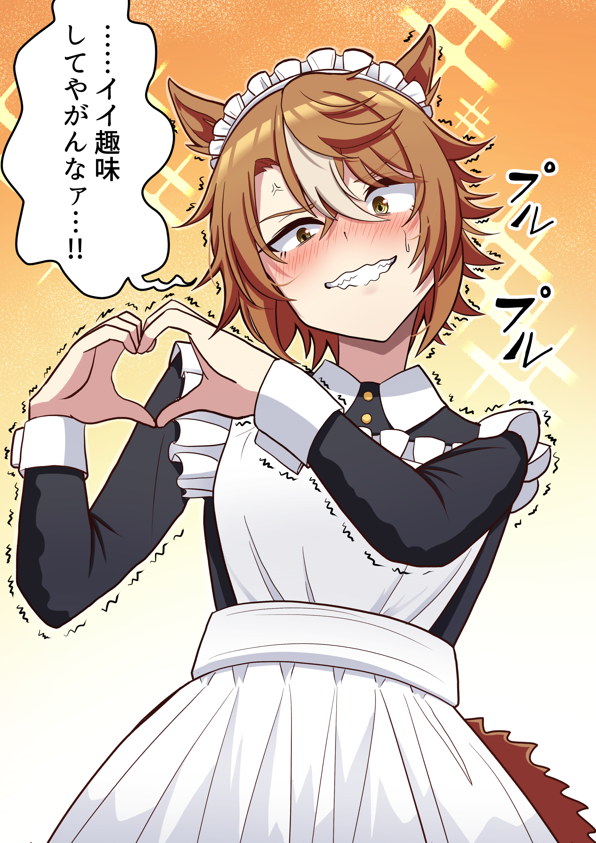 1girl absurdres alternate_costume anger_vein animal_ears apron black_dress blush brown_hair dicta_striker_(umamusume) dress embarrassed enmaided frilled_apron frills heart heart_hands highres horse_ears horse_girl long_sleeves looking_at_viewer maid maid_apron maid_headdress missan_sun multicolored_hair short_hair solo streaked_hair trembling umamusume umamusume:_cinderella_gray wavy_mouth white_apron white_hair yellow_eyes