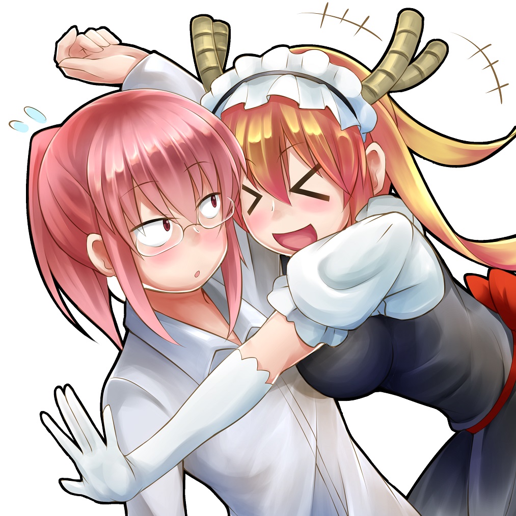 >_< 2girls black_dress commentary_request dragon_girl dragon_horns dress glasses gloves horns kirishima_itsuki kobayashi-san_chi_no_maidragon kobayashi_(maidragon) looking_at_another maid multiple_girls open_mouth pink_hair ponytail puffy_short_sleeves puffy_sleeves red_hair shirt short_sleeves simple_background smile tohru_(maidragon) white_background white_gloves white_shirt