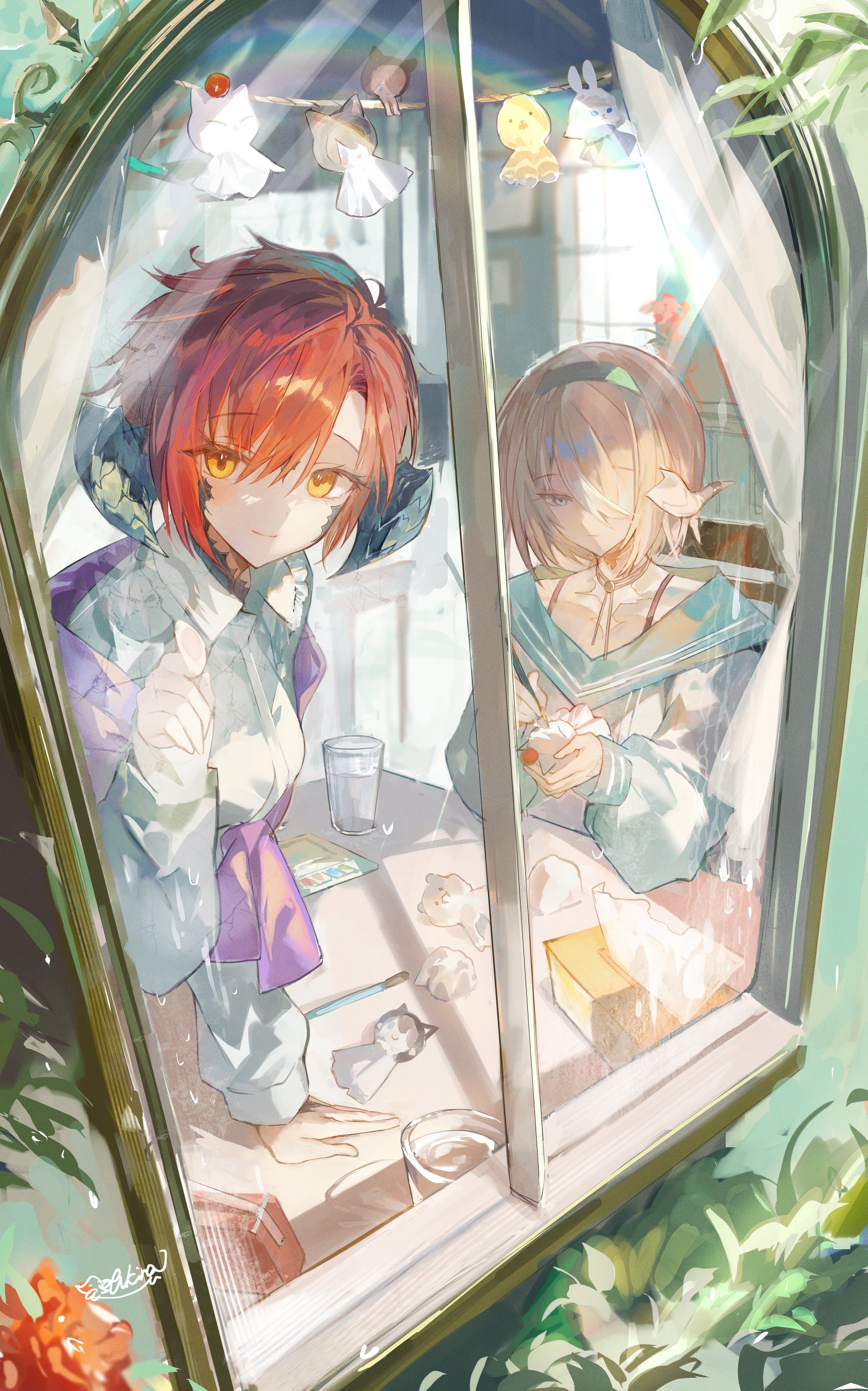 2girls absurdres au_ra blonde_hair blue_eyes cup dragon_girl dragon_horns drinking_glass final_fantasy final_fantasy_xiv great_serpent_of_ronka hairband highres horns loporrit moogle multiple_girls red_hair sailor_collar scales shikina_(mochigushi_) shirt signature table teruterubouzu warrior_of_light_(ff14) water white_shirt window yellow_eyes