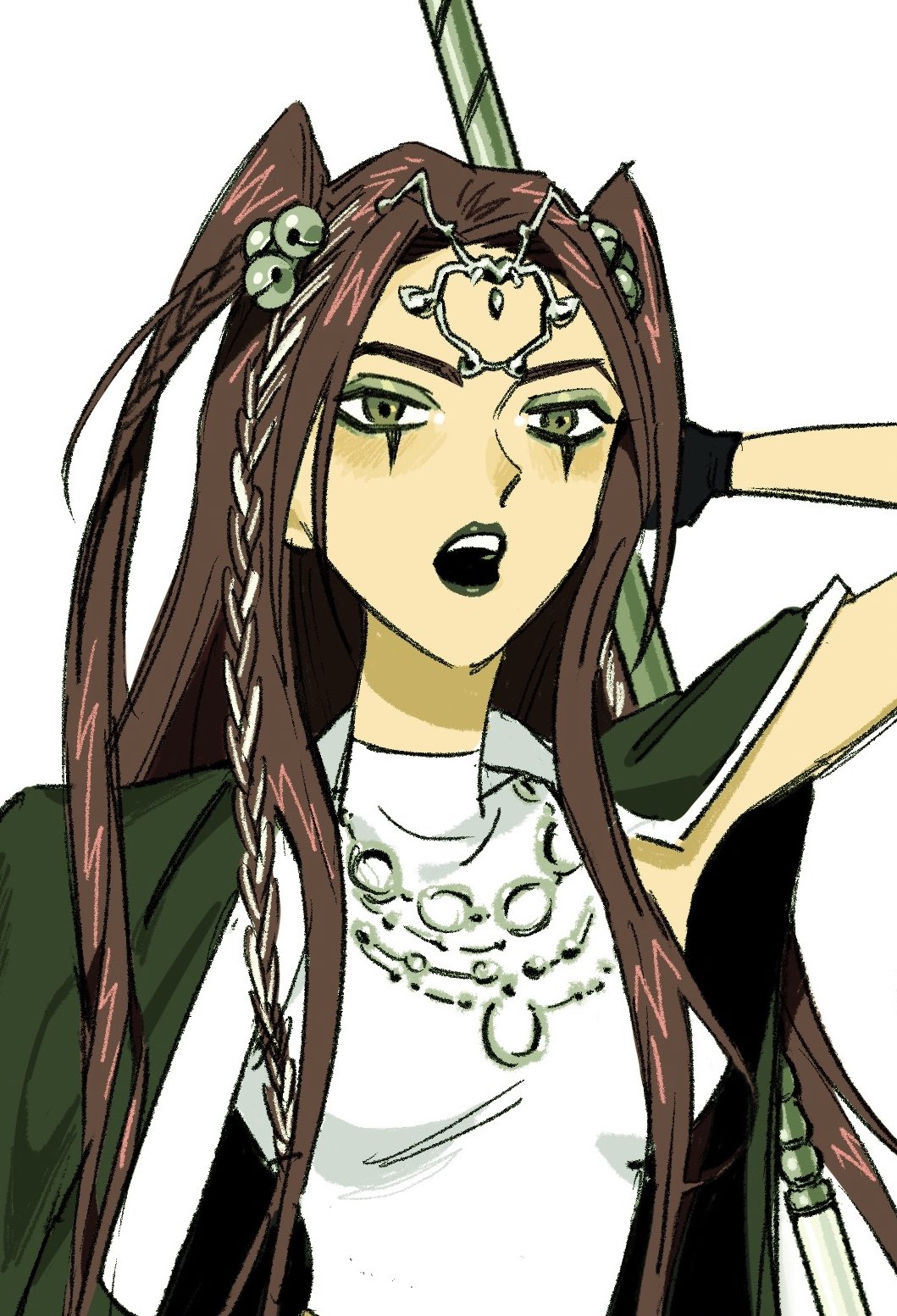 1girl aespa black_gloves black_lips eyeshadow gloves green_eyeshadow highres holding holding_polearm holding_weapon korean_commentary kouwn kpop_demon_hunters looking_at_viewer makeup mira_(kpop_demon_hunters) open_mouth polearm shirt simple_background sleeveless sleeveless_shirt solo turtleneck upper_body weapon white_background
