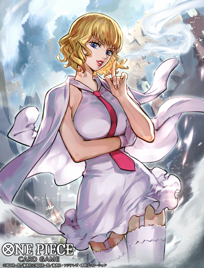 1girl blonde_hair blue_hair blunt_bangs cardigan commentary_request copyright_name cowboy_shot dress dutch_angle eyelashes garter_straps gloves necktie nijihayashi official_art one_piece one_piece_card_game pink_necktie red_lips short_hair single_glove smile smoke solo stussy_(one_piece) thighhighs white_cardigan white_dress white_gloves white_thighhighs