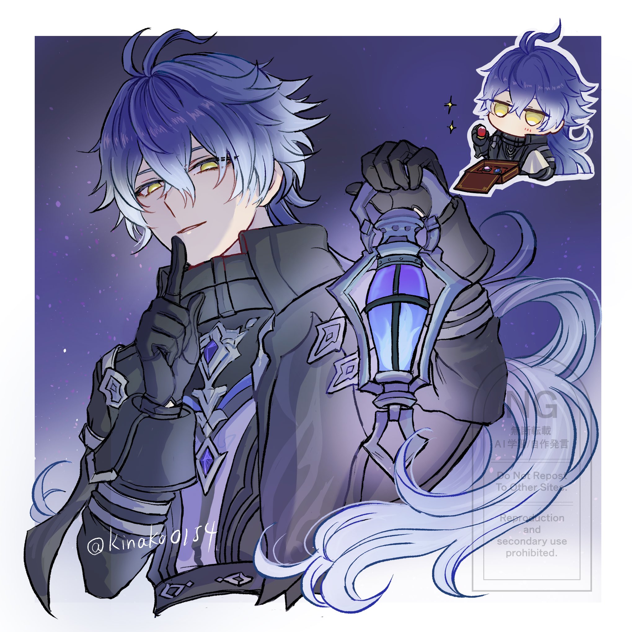 1boy antenna_hair black_coat black_gloves blue_fire blue_hair border chibi chibi_inset coat commentary_request cropped_torso crossed_bangs finger_to_mouth fire flins_(genshin_impact) genshin_impact gloves gradient_hair hair_between_eyes hands_up high_collar highres holding holding_lantern index_finger_raised kinako0154 lantern long_hair long_sleeves male_focus multicolored_hair outside_border parted_lips shushing solo twitter_username upper_body watermark white_border yellow_eyes
