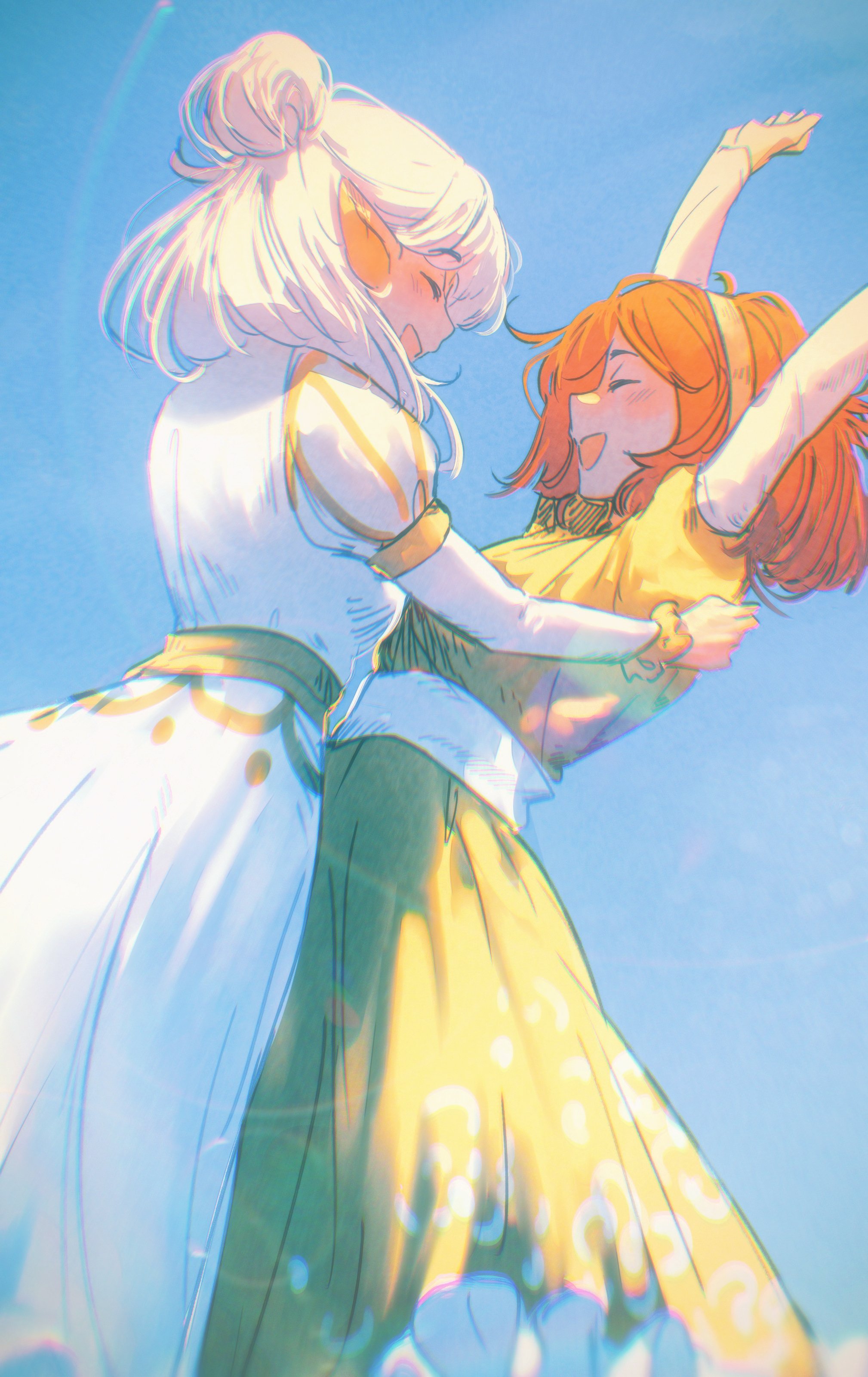 2girls :d \o/ absurdres arms_up asimov_(spindle_(aidenr0)) belt blue_background bob_cut breasts closed_eyes dancing dress elf face-to-face facing_another feet_out_of_frame green_dress hair_up hairband highres juliet_sleeves long_sleeves loose_hair_strand medium_breasts medium_hair multiple_girls open_mouth original ottilie_(spindle_(aidenr0)) outstretched_arms pointy_ears puffy_sleeves revision sash short_hair smile spindle_(aidenr0) white_belt white_dress white_hair white_sash yellow_belt yellow_hairband yellow_sash
