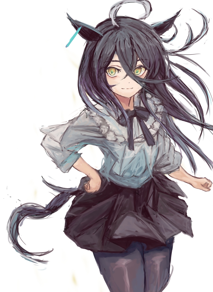 1girl ahoge animal_ears black_bow black_hair black_pantyhose black_skirt bow closed_mouth ear_tag earrings hair_between_eyes horse_ears horse_girl horse_tail jewelry long_bangs long_hair long_hair_between_eyes long_sleeves looking_at_viewer manhattan_cafe_(umamusume) multicolored_hair pantyhose pleated_skirt shirt simple_background single_earring skirt smile solo tail umamusume white_background white_hair white_shirt yanagi_wakana yellow_eyes
