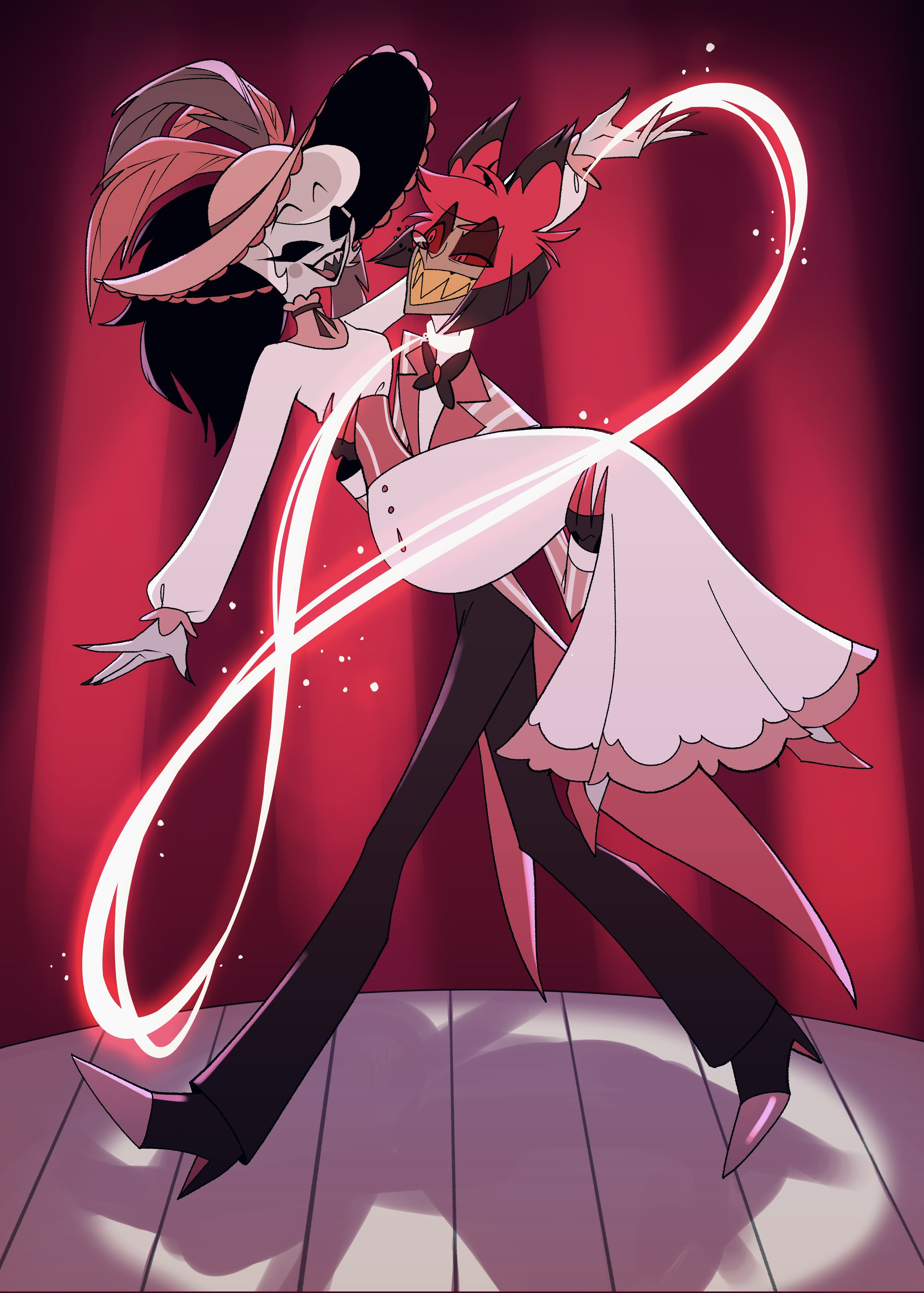 1boy 1girl absurdres alastor_(hazbin_hotel) black_pants collared_shirt commentary dress hazbin_hotel hellaverse highres iv_kfgh long_dress pants pink_shirt red_hair rosie_(hazbin_hotel) shirt short_hair untranslatable_commentary white_dress white_hair