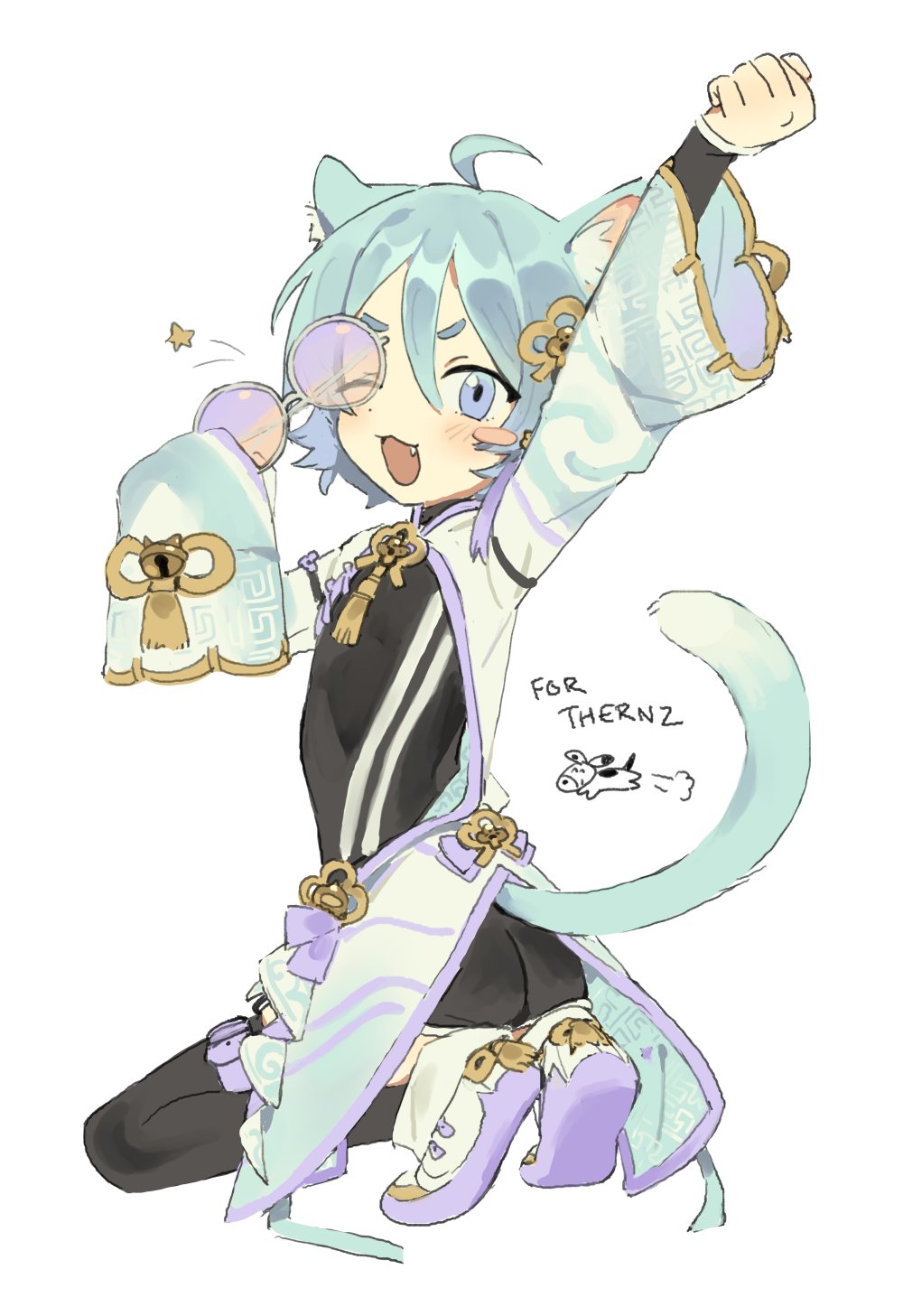 1girl :d ahoge animal_ears arm_up ass black_bodysuit blue_eyes blue_hair bodysuit cat_ears cat_girl cat_tail clenched_hand fang highres holding holding_removed_eyewear indie_virtual_youtuber kneeling mota_(motaberrie) one_eye_closed open_mouth signature sleeves_past_wrists smile solo tail thernz_(character) tiptoes unworn_eyewear virtual_youtuber white_background wide_sleeves
