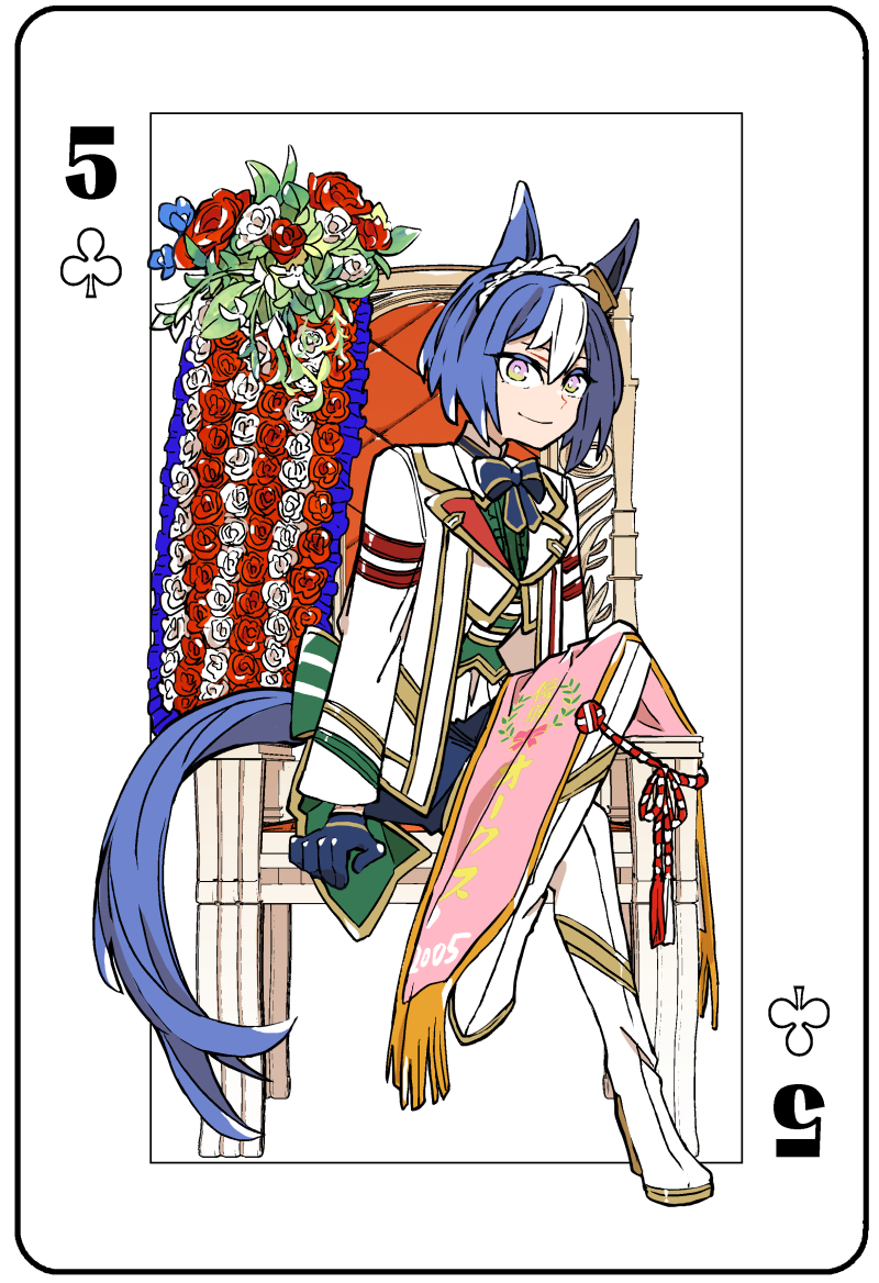 1girl asuka_(junerabitts) blue_hair boots braid breasts card_(medium) cesario_(future_weaver)_(umamusume) cesario_(umamusume) chair commentary_request flower full_body gloves looking_at_viewer medium_breasts medium_hair ribbon sash sitting smile solo thigh_boots umamusume white_background
