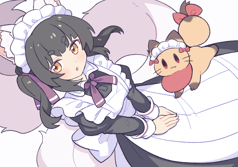 1girl :3 :o animal animal_ear_fluff animal_ears apron black_dress black_hair blush bow cowboy_shot dot_nose dress fox fox_ears fox_girl fox_tail hair_ribbon juliet_sleeves long_hair long_sleeves looking_at_viewer maid maid_headdress neck_ribbon open_mouth original puffy_sleeves purple_ribbon red_bow ribbon simple_background solo suzuno_(suzuno3110) tail thick_eyebrows twintails white_apron white_background yellow_eyes