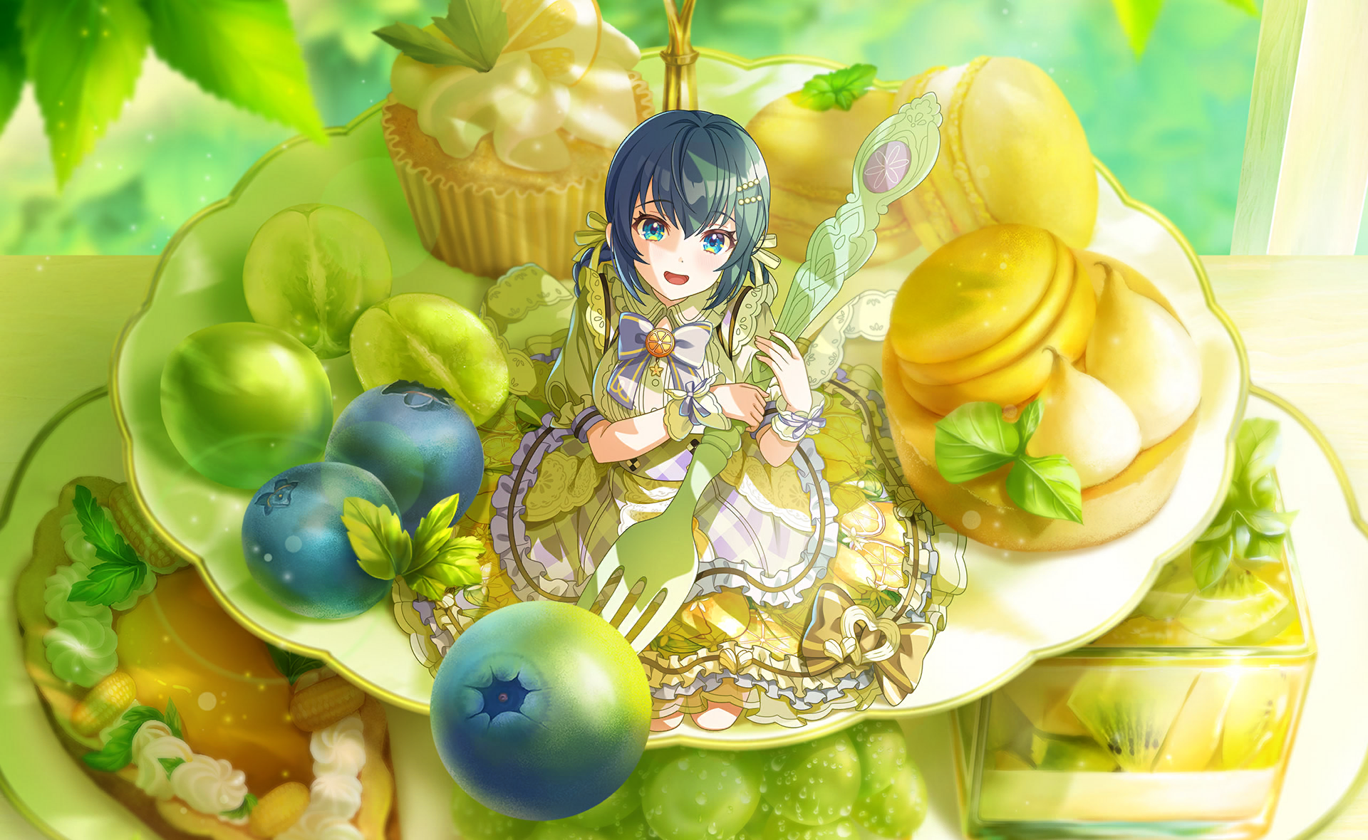 1girl :d blue_eyes blue_hair blush bow braid commentary_request dress flower food frills fruit game_cg hair_between_eyes hair_ornament highres holding leaf long_hair looking_at_viewer mini_person minigirl official_art open_mouth shizuka_(world_dai_star) short_sleeves smile solo third-party_source very_long_hair world_dai_star wrist_cuffs yellow_dress