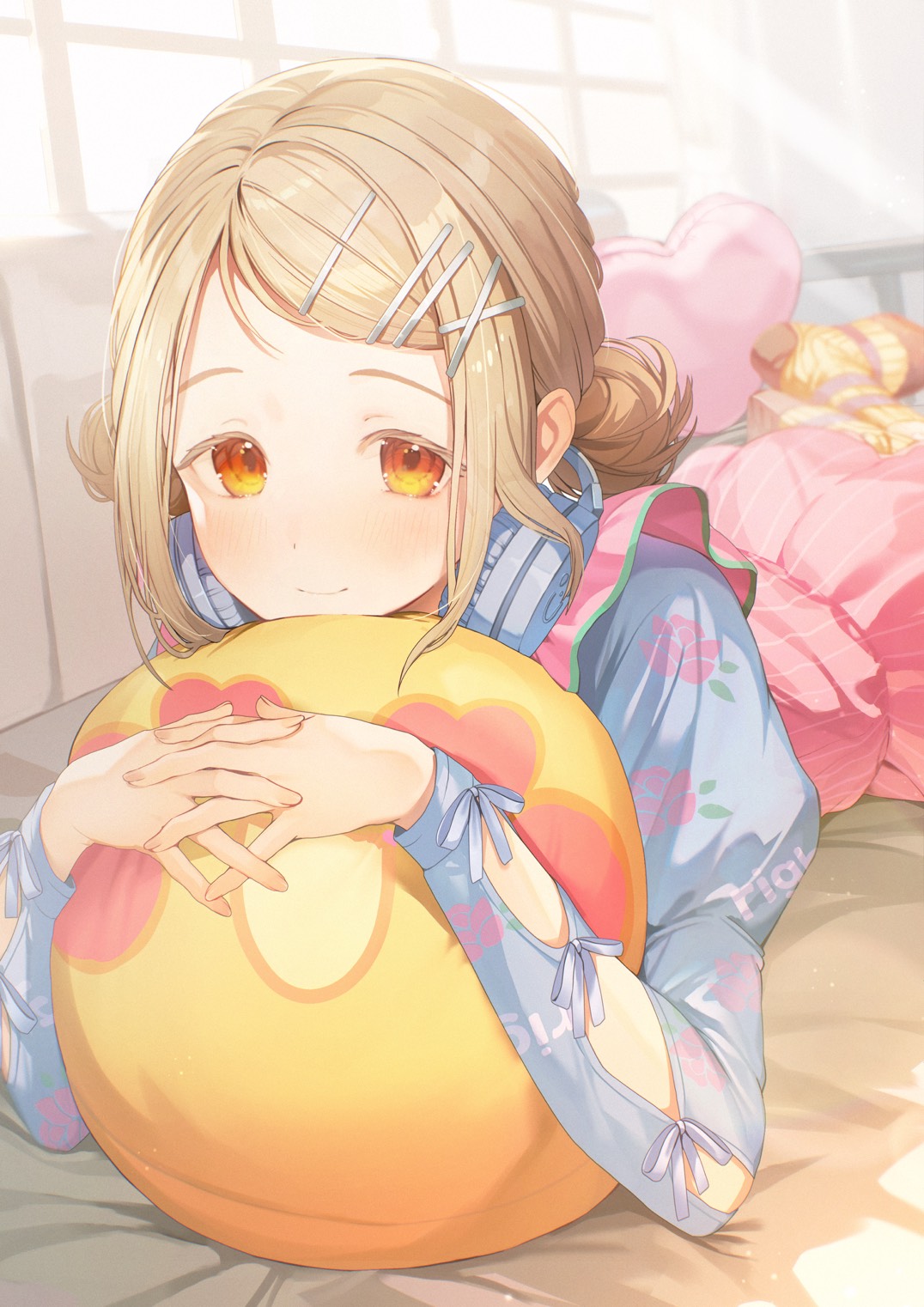 1girl blonde_hair blue_shirt blush braid closed_mouth clothes_writing commentary_request dress fingernails floral_print full_body gakuen_idolmaster hair_bun hair_ornament hairclip headphones headphones_around_neck highres hugging_object idolmaster indoors juliet_sleeves long_sleeves looking_at_viewer lying medium_hair miracle_na_now!_(idolmaster) on_stomach orange_eyes own_hands_together parallel_hairclips pillow pillow_hug pink_dress puffy_sleeves shinosawa_hiro shirt smile socks solo sunlight swept_bangs tetta_(tettaakira) twin_braids window x_hair_ornament yellow_socks