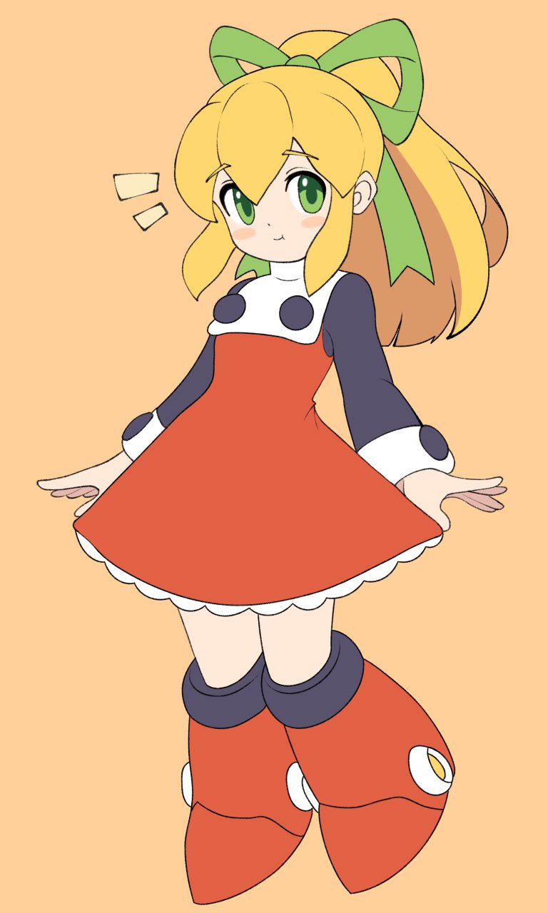 1girl blonde_hair blush boots bow closed_mouth commentary dress english_commentary full_body green_bow green_eyes hair_between_eyes hair_bow highres long_hair long_sleeves mega_man_(classic) mega_man_(series) ponytail red_boots red_dress roll_(mega_man) samme_hacci sidelocks smile solo