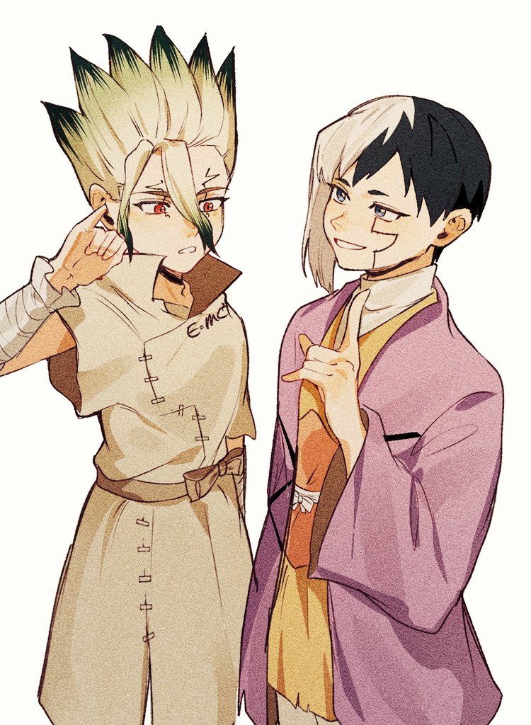 0a_9_(pixiv82791714) 2boys asagiri_gen asymmetrical_hair bandaged_arm bandages black_hair blue_eyes cracked_skin dr._stone facial_mark gradient_hair green_hair grin hair_between_eyes hand_up index_finger_raised ishigami_senkuu jacket long_sleeves looking_at_another male_focus multicolored_hair multiple_boys purple_jacket red_eyes short_hair simple_background smile spiked_hair split-color_hair tunic turtleneck two-tone_hair white_background white_hair wide_sleeves