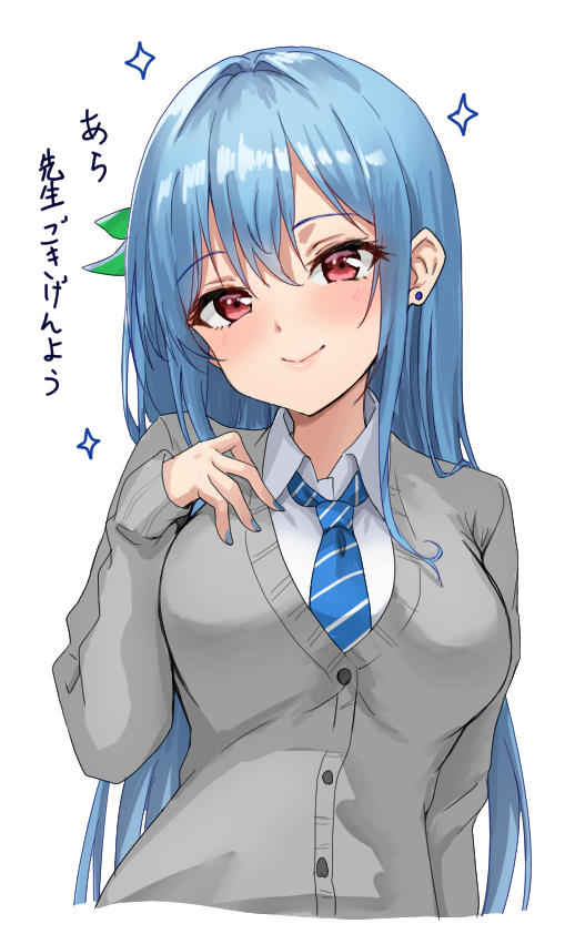 1girl alternate_costume amagi_(amagi626) blue_hair blue_nails blue_necktie blush cardigan closed_mouth collared_shirt commentary_request cropped_torso diagonal-striped_clothes diagonal-striped_necktie dress_shirt earrings grey_cardigan hinanawi_tenshi jewelry long_hair looking_at_viewer necktie red_eyes school_uniform shirt solo sparkle striped_clothes stud_earrings touhou translation_request upper_body white_shirt
