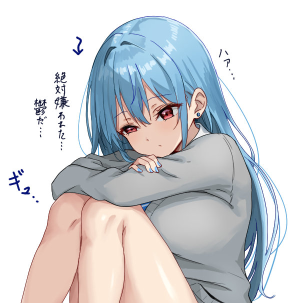 1girl alternate_costume amagi_(amagi626) blue_hair blue_nails cardigan closed_mouth commentary_request earrings grey_cardigan hinanawi_tenshi jewelry red_eyes school_uniform solo stud_earrings touhou translation_request