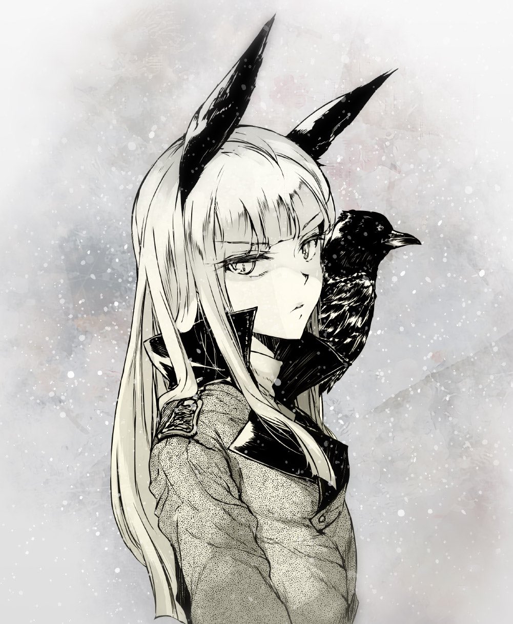 1girl animal_ears bird bird_ears bird_girl crow grete_m._gollob greyscale highres jacket long_hair looking_at_viewer monochrome solo upper_body world_witches_series yumemitsuki_(hagakure)