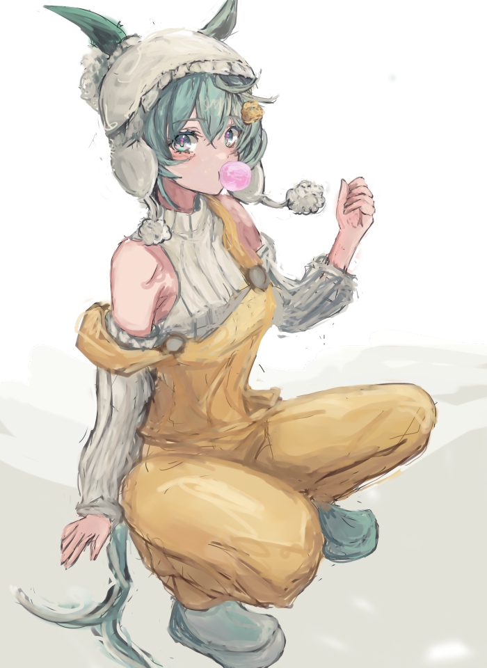 1girl animal_ears bare_shoulders blowing_bubble_gum blue_eyes blush breasts chewing_gum detached_sleeves ear_covers ears_through_headwear flower grey_hair hair_between_eyes hair_flower hair_ornament hairclip hat horse_ears horse_girl horse_tail looking_at_viewer overalls pants seiun_sky_(umamusume) shoes short_hair simple_background single_ear_cover small_breasts solo squatting sunflower sunflower_hair_ornament sweater tail umamusume white_hat white_sweater yanagi_wakana yellow_overalls yellow_pants