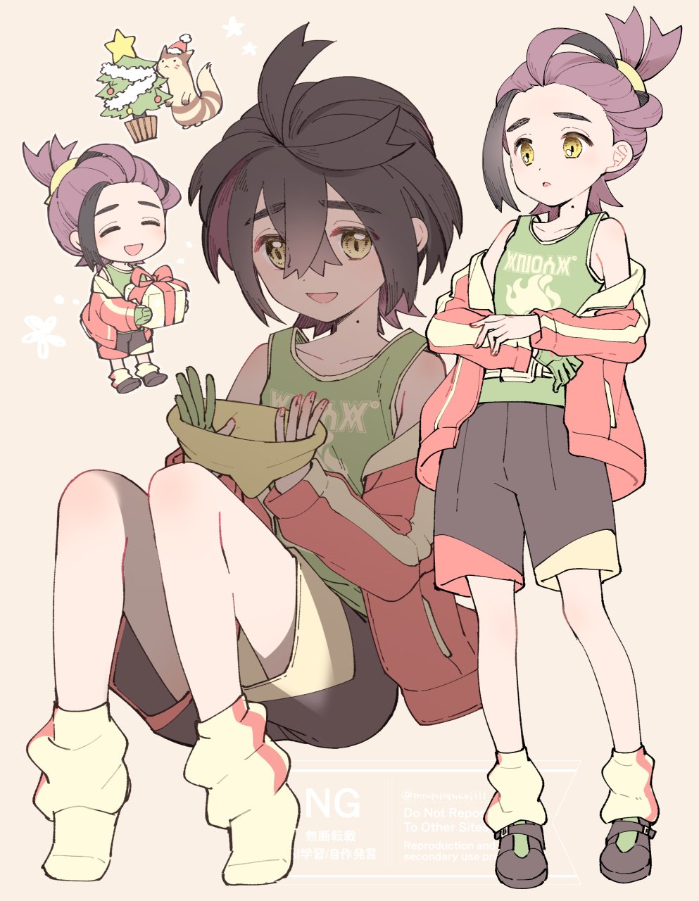 1boy alternate_color black_hair black_shoes black_shorts box chibi chibi_inset christmas christmas_tree closed_eyes commentary_request crossed_bangs furret gen_2_pokemon gift gift_box gloves green_gloves green_tank_top highres holding holding_gift jacket kieran_(pokemon) long_sleeves male_focus mmmmmarilll mole mole_on_neck multicolored_hair nintendo off_shoulder open_clothes open_jacket open_mouth pokemon pokemon_(creature) pokemon_masters_ex purple_hair red_jacket shoes shorts simple_background single_glove sitting socks standing star_(symbol) tank_top yellow_eyes yellow_socks