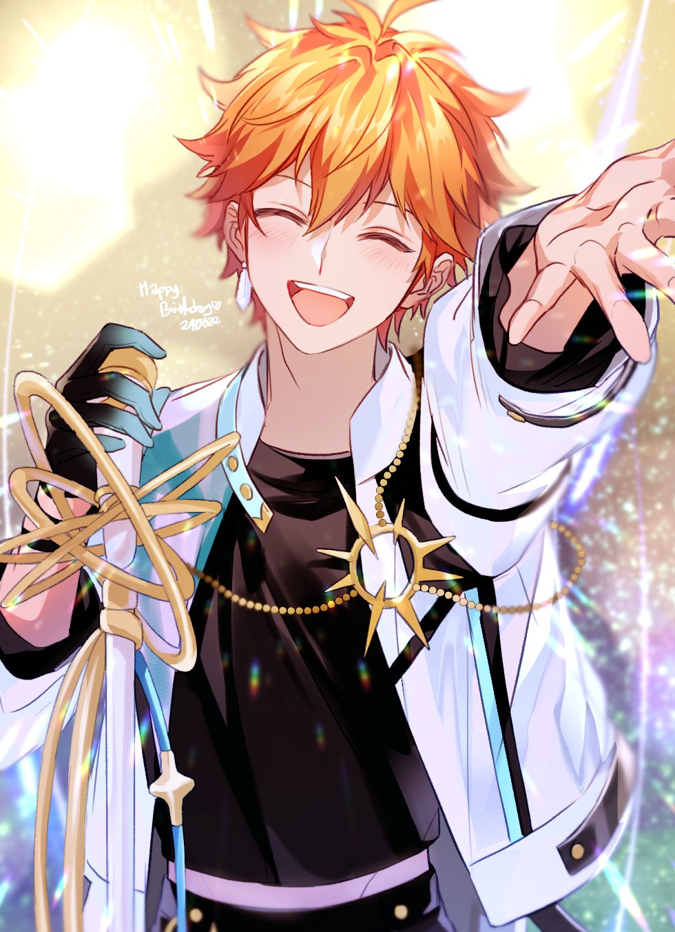 1boy akehoshi_subaru arm_up black_gloves black_shirt closed_eyes ensemble_stars! gloves hair_between_eyes highres holding holding_microphone jacket kwanmaengg long_sleeves male_focus microphone microphone_stand official_alternate_costume open_clothes open_jacket open_mouth orange_hair outstretched_arm shirt short_hair single_glove smile solo stage teeth tongue upper_body upper_teeth_only white_jacket