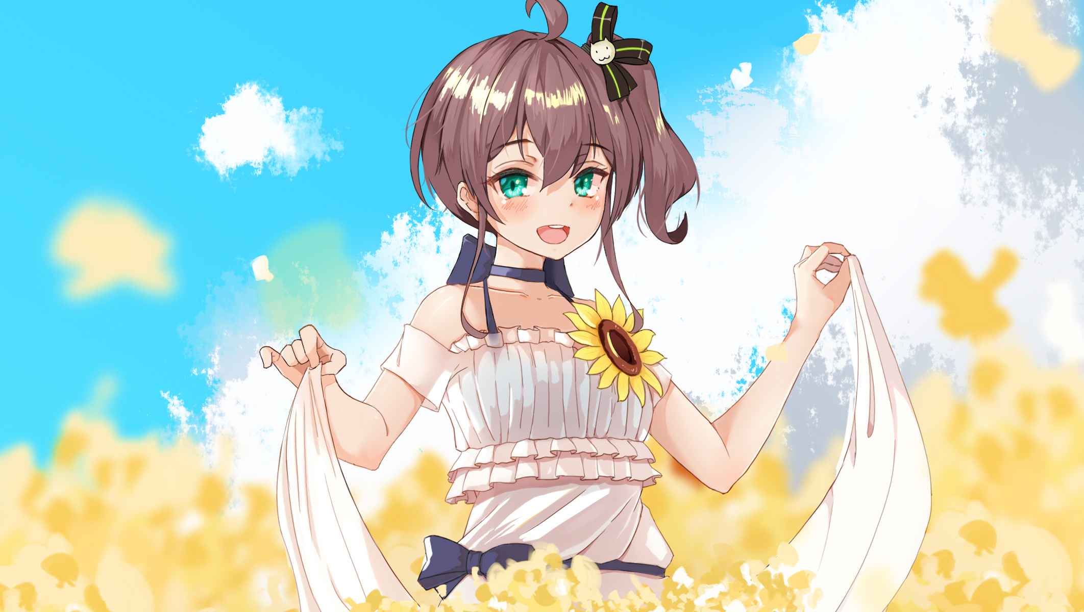 1girl :d ahoge alternate_costume bare_shoulders black_choker blue_sky brown_hair chinese_commentary choker cloud collarbone commentary_request cropped dress field flower flower_field green_eyes highres holding_own_dress hololive kurokuma_shachou looking_at_viewer natsuiro_matsuri open_mouth outdoors short_hair side_ponytail sky smile solo standing teeth upper_teeth_only virtual_youtuber white_dress