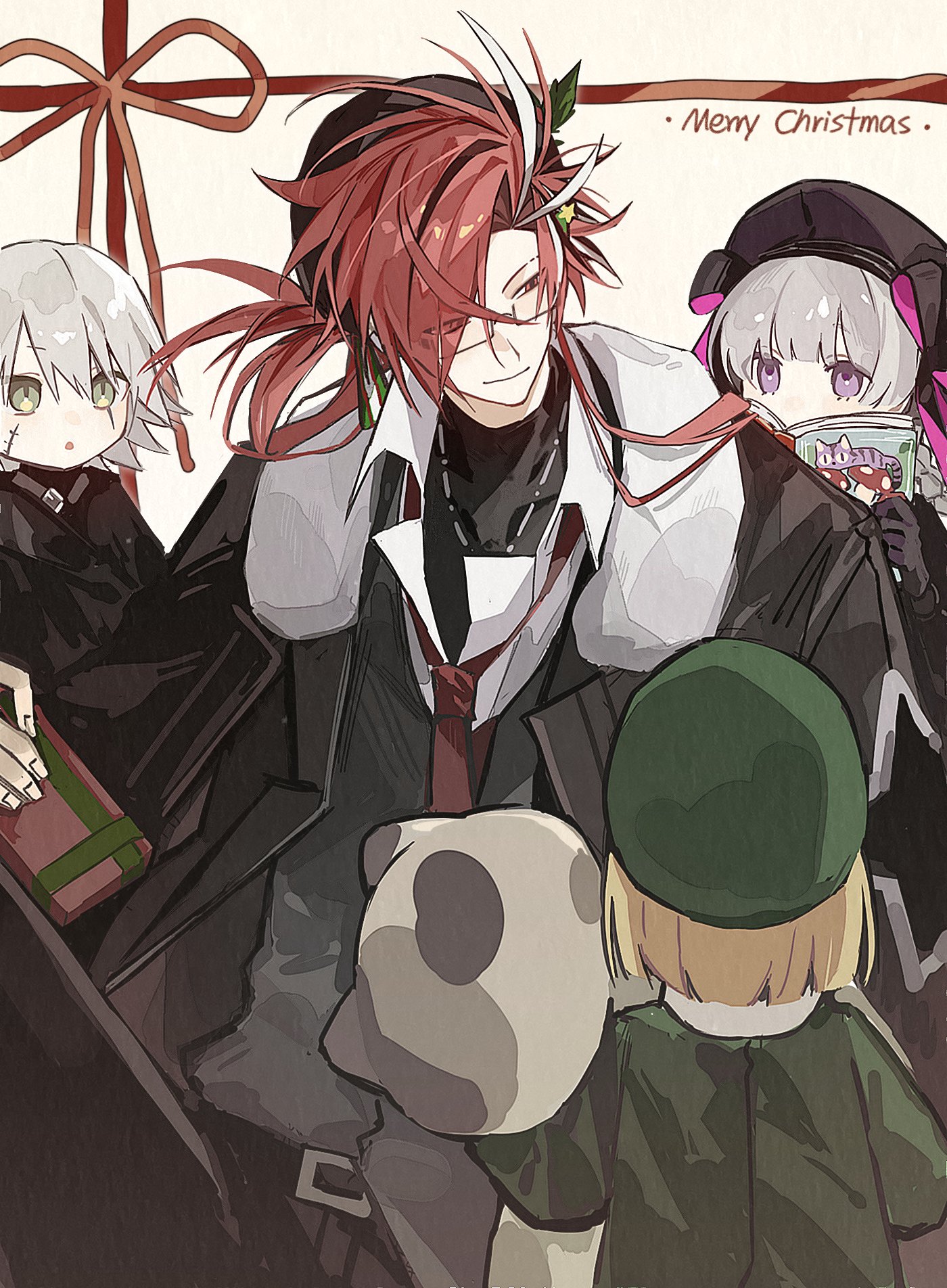 1boy 3girls black_hat black_jacket black_pants blonde_hair book closed_mouth dianci_sanweixian fate/grand_order fate_(series) glasses green_eyes green_hat grey_hair hair_over_one_eye hat highres holding holding_book jack_the_ripper_(fate/apocrypha) jacket merry_christmas multiple_girls necktie nursery_rhyme_(fate) pants paul_bunyan_(fate) purple_eyes red_necktie scar scar_on_face takasugi_shinsaku_(fate)