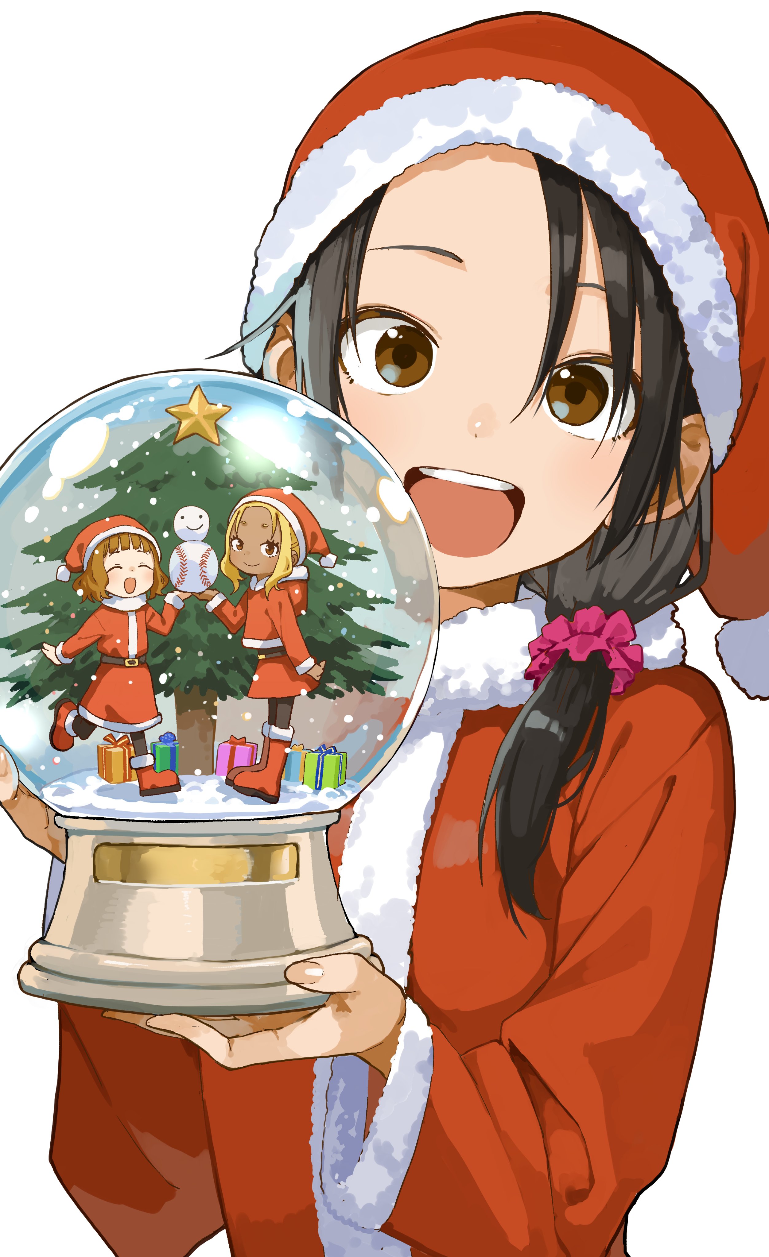 3girls :d absurdres black_hair christmas hat highres himemiya_yuki ichinose_karina looking_at_viewer manemane_nichinichi medium_hair mini_person minigirl multiple_girls nagisa_akane open_mouth purple_eyes red_hat santa_costume santa_hat smile snow_globe teeth upper_teeth_only white_background yamamoto_souichirou